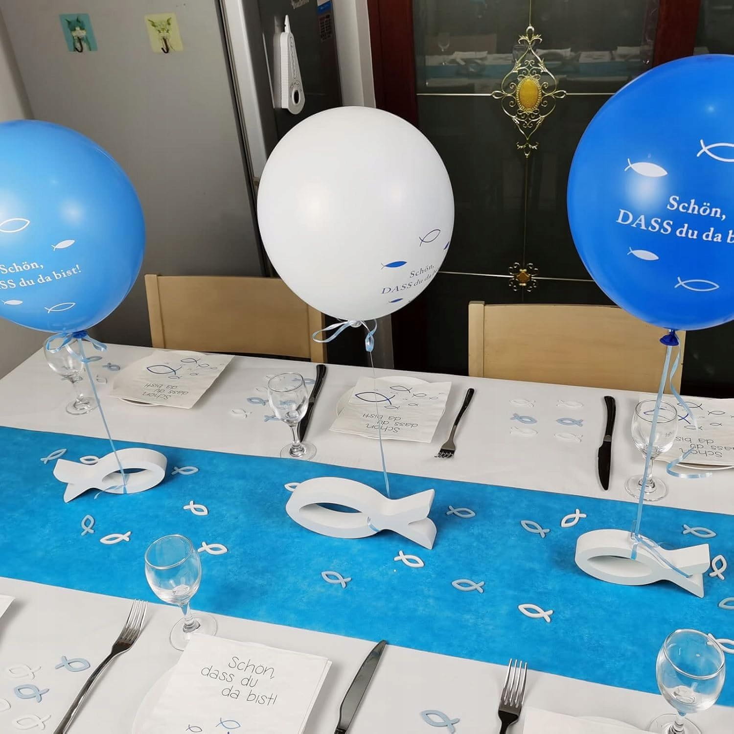 Set dekoracija s motivom ribe predstavlja prikladan izbor za različite prigode, uključujući krštenja, pričesti, krizme ili druge svečanosti. Motiv ribe nije samo drevni kršćanski simbol, već i horoskopski znak, simbol sreće i obilja. Ovaj set obuhvaća salvete, balone i drvene ribe, stvarajući usklađenu i privlačnu dekoraciju stola. S ukupno 98 elemenata, set nudi sve potrebno za tematsko uređenje, naglašavajući simboliku i estetsku vrijednost. Komponente su izrađene od materijala koji osiguravaju trajnost i funkcionalnost, dok plavo-bijela shema boja doprinosi mirnom i svečanom izgledu. Drvene ribe su estetski ugodne i izdržljive, salvete su meke i upijajuće, a baloni su izrađeni od otpornog materijala. Ovaj set omogućuje jednostavno postavljanje tematske dekoracije koja će obogatiti svaku proslavu. Zbog svoje simbolike i kvalitete izrade, set je dizajniran da doda poseban karakter svakom događaju, ostavljajući dojam na goste. Proizvod je namijenjen za dekorativnu upotrebu i treba ga koristiti u skladu s priloženim sigurnosnim uputama.