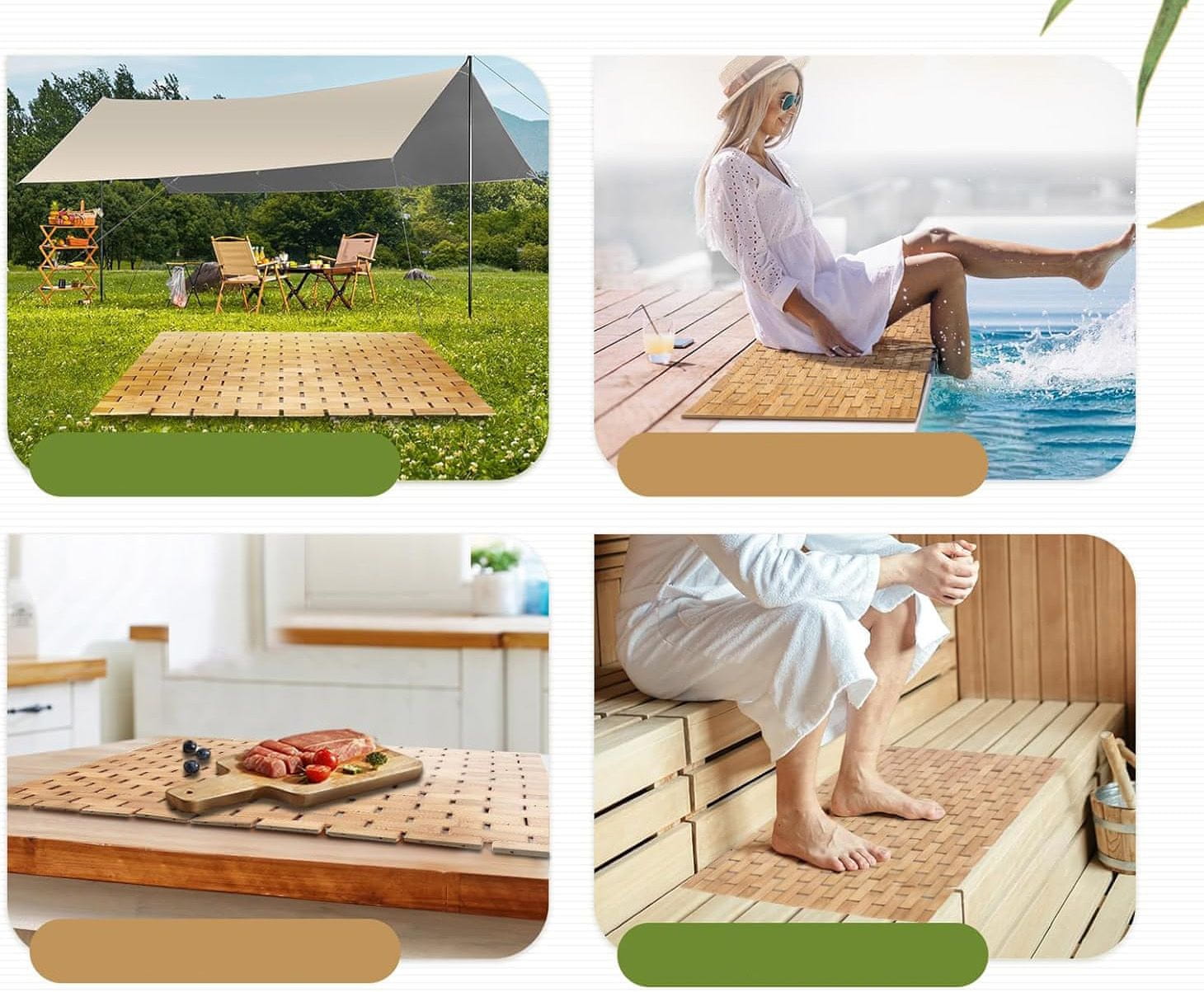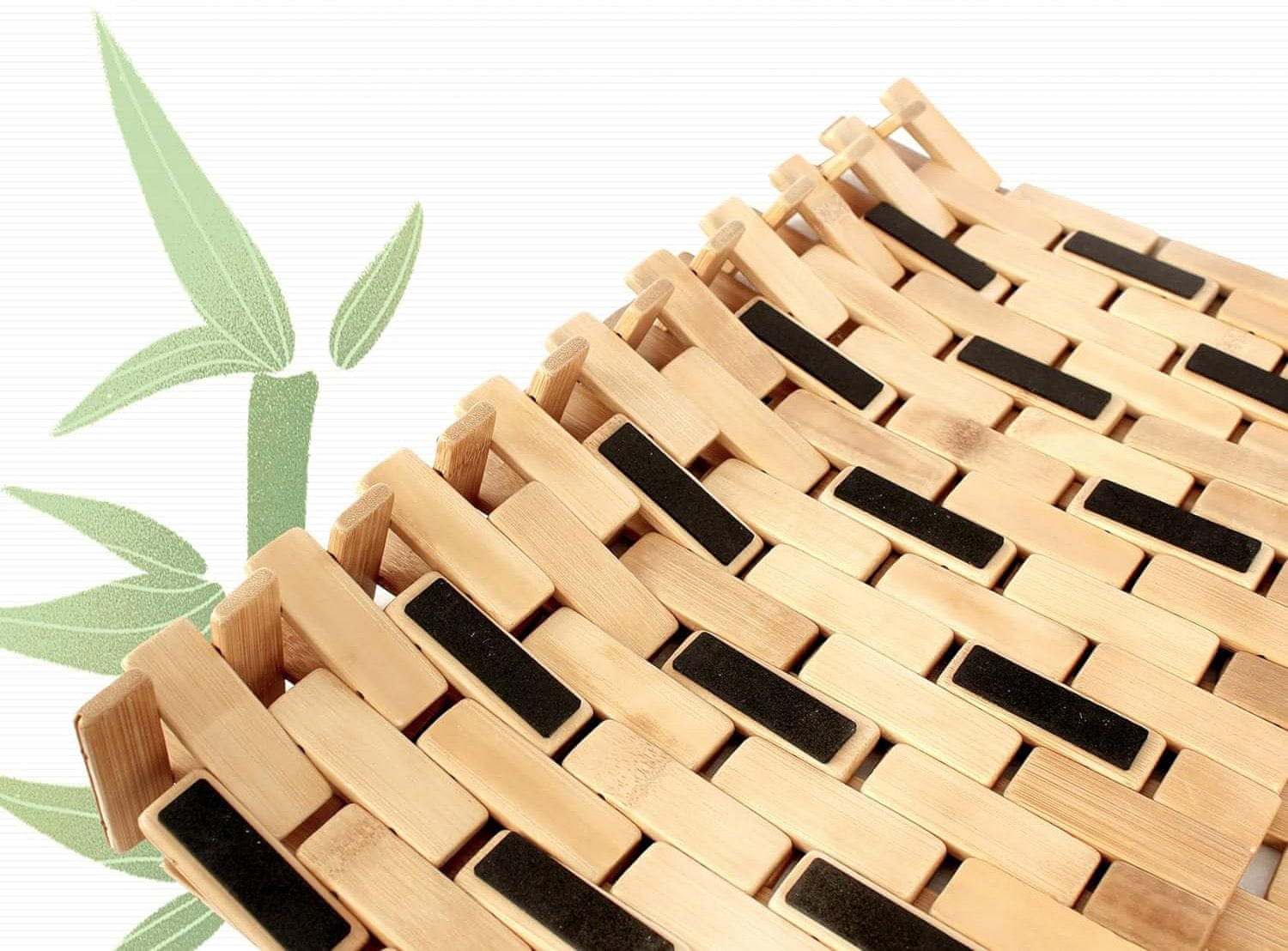 Prostirka izrađena od 100% prirodnog, vodootpornog bambusovog drva.Sigurna – površina od bambusa osigurava stabilnost i sigurnost.Protuklizne podloge.Materijal je potpuno otporan na vlagu i brzo se suši; Također je lako održavati čistom, ne morate brinuti o tragovima ili vidljivim prskanjima.