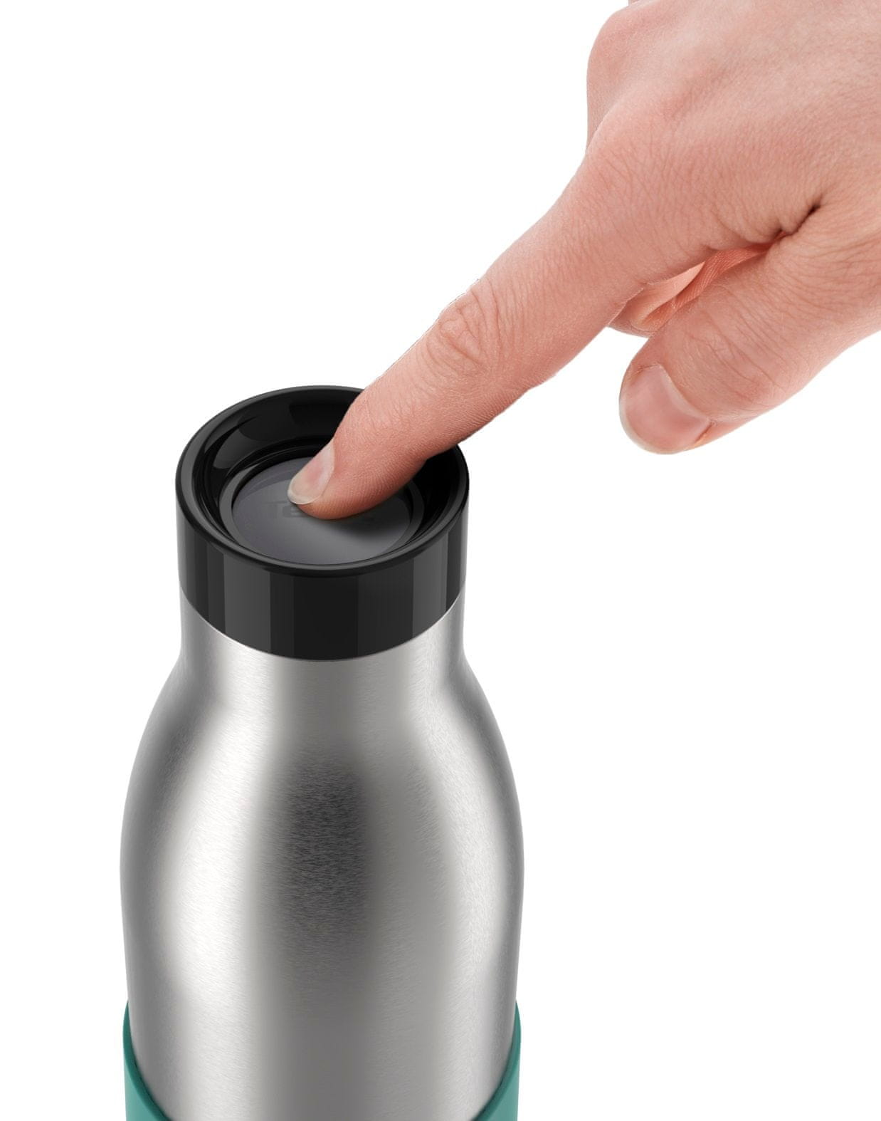 Tefal Bludrop Sleeve (N3110610) s volumenom od 0,5 l i ergonomskom silikonskom navlakom za udobno držanje odlično je rješenje za tople i hladne napitke. Izrađen je od nehrđajućeg čelika s brušenom završnom obradom i jedinstvenim poklopcem s brzim pritiskom za piće sa svih strana otvora.