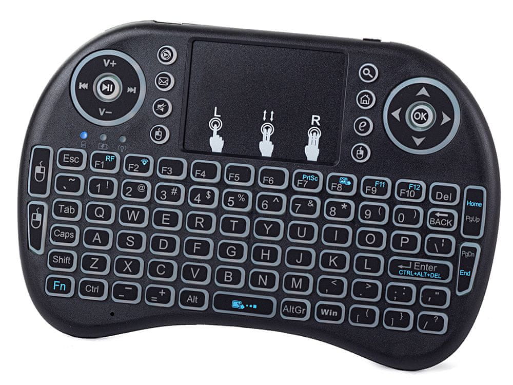 Multimedijska osvijetljena tipkovnica vrlo je praktičan uređaj, koristan i kod kuće i u pokretu. Tipkovnica je kompatibilna s većinom Android, Windows, Linux uređaja. Zahvaljujući ovoj praktičnoj tipkovnici možemo upravljati uređajima kao što su: stolno računalo, prijenosno računalo, TV, XBOX360, PS3 igraća konzola. Spajanjem OTG adaptera tipkovnica će raditi i sa pametnim telefonima i tabletima.