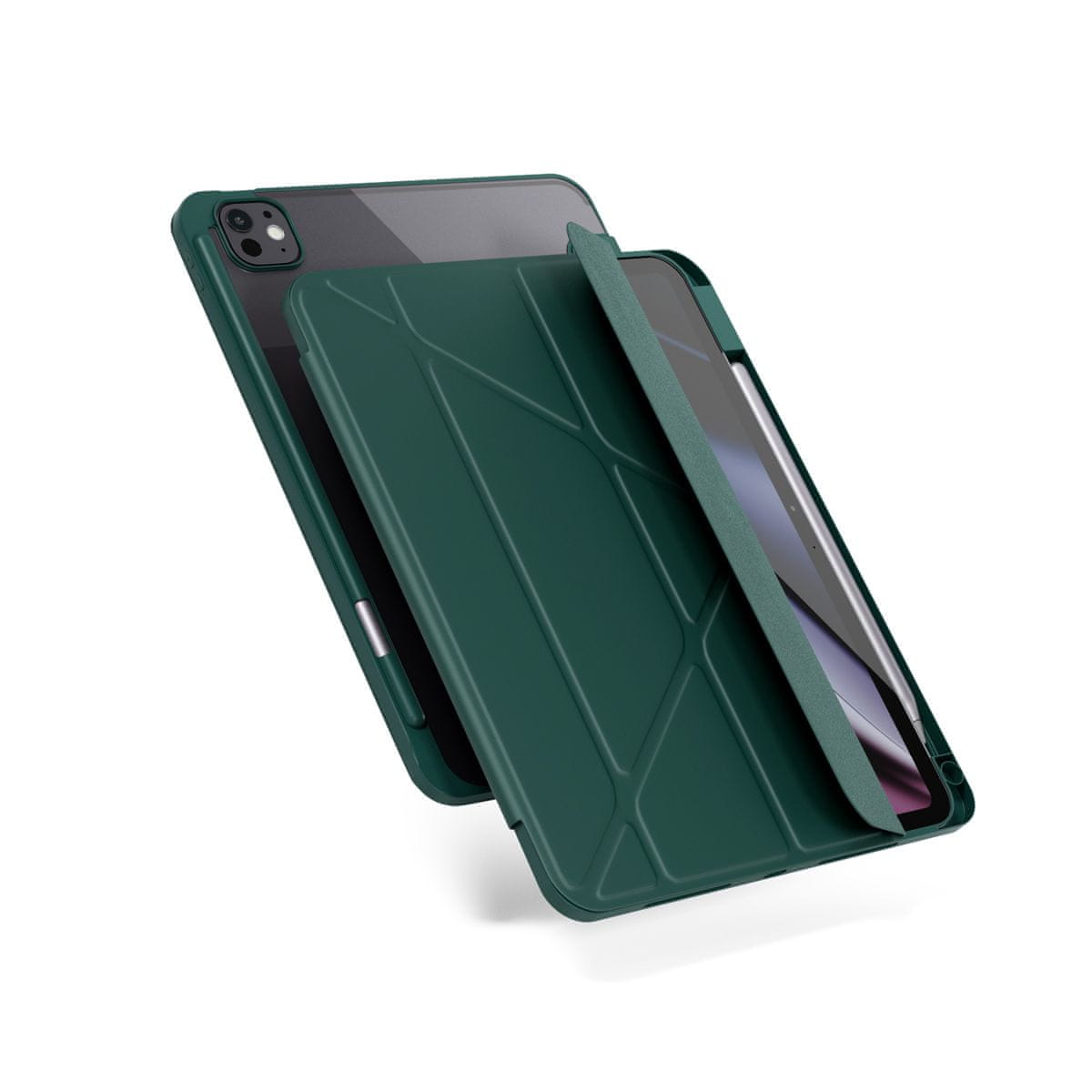 Etui je dizajniran tako da vašem iPadu pruža zaštitu, a da pritom ne skriva njegov dizajn. Prozirna stražnja strana omogućuje da originalni izgled uređaja ostane vidljiv, dok čvrst okvir od TPU materijala ublažava vibracije i štiti od udaraca. Za maksimalnu produktivnost brine se funkcionalni stalak koji možete prilagoditi za udobno tipkanje ili opušteno gledanje videozapisa. Kako bi vaše stvaranje bilo neometano, u etui je integriran i siguran prostor za pohranu olovke Apple Pencil.