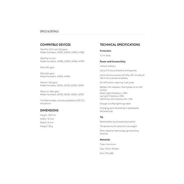 - Kompatibilnost: iPad Pro 12.9 inčni 3. generacije (modeli: A1876, A2014, A1895, A1983), iPad Pro 11 inčni (modeli: A1980, A2013, A1934, A1979), iPad Air 3. gen (modeli: A2152, A2123, A2153, A2154), iPad Mini 5. gen (modeli: A2133, A2124, A2126, A2125), iPad 6. gen (modeli: A1893, A1954) treba biti ažuriran na iOS 12.2 ili noviji