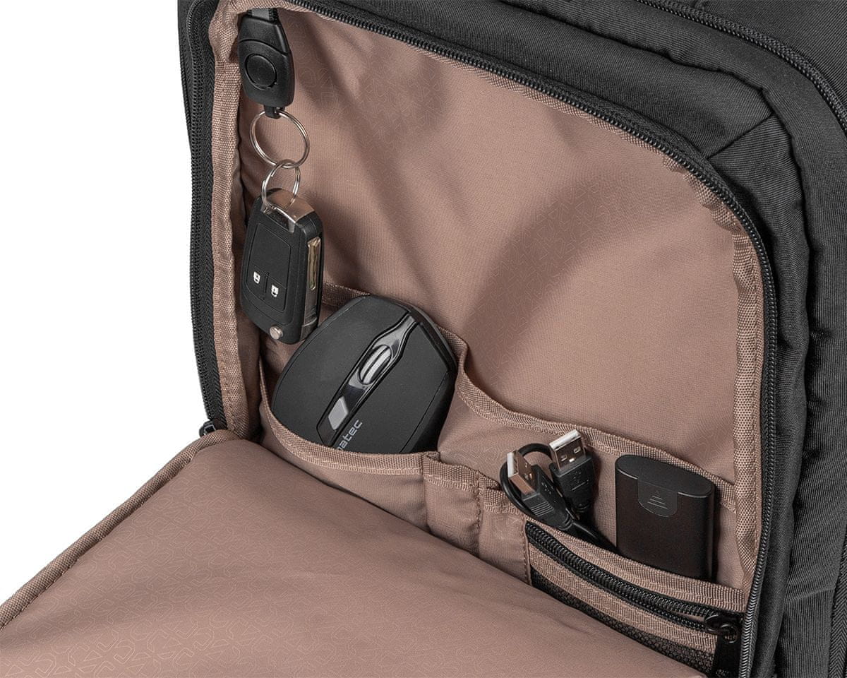 3 unutarnja džepa: dovoljno prostora za pohranjivanje prijenosnog računala, dodataka, dokumenata, pa čak i proširivi džep za odjeću! Još više dodatnog prostora: 2 dodatna džepa sprijeda i poseban džep za spremanje pića sa strane. Kvalitetni materijali: izdržljivi i dugotrajni materijali koji podnose sve vremenske uvjete i imaju vodootporna svojstva. Potpuna fleksibilnost: podesive naramenice i dodatna naramenica za prsa, kao i ojačana ručka za iznimno jednostavno podešavanje bez obzira na vaše potrebe. Sustav kolica: možete pričvrstiti ruksak na ručku putnog kovčega.Osnovne stvari uvijek pri ruci