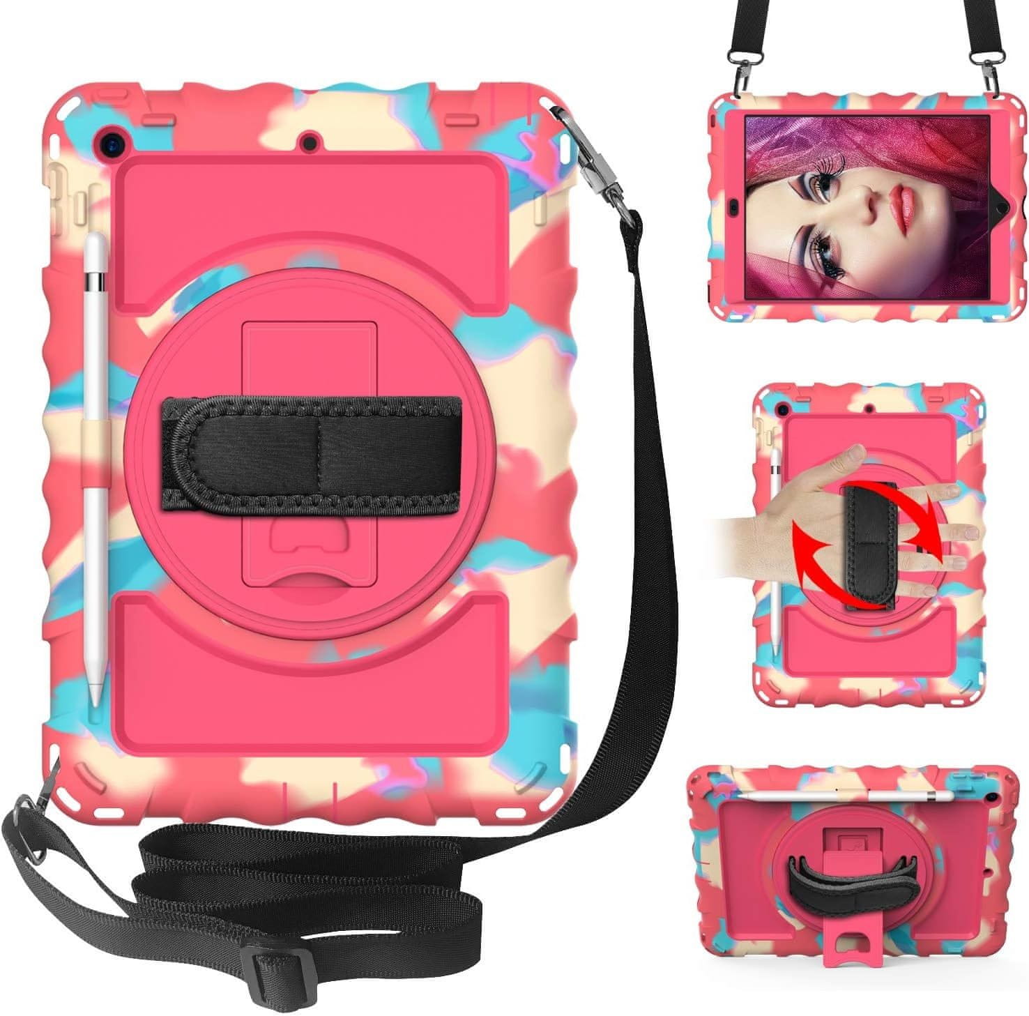 Nikcorp Robusna zaštitna maska za iPad 6/5/Pro 9.7" s rotirajućim stalkom, držačem za ruku i naramenicom, roza