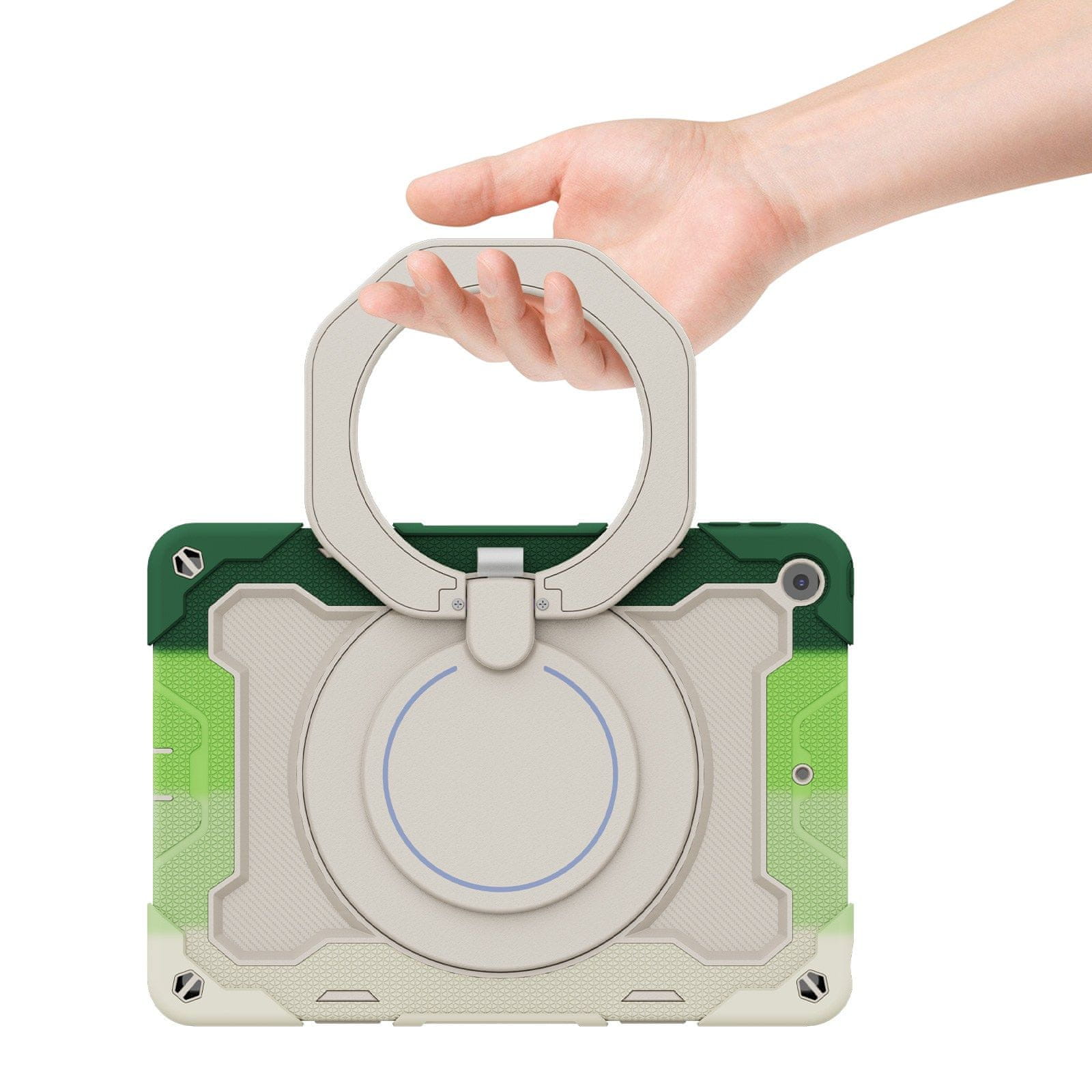 - Ergonomski držač: Omogućuje sigurno i stabilno držanje iPada jednom rukom.