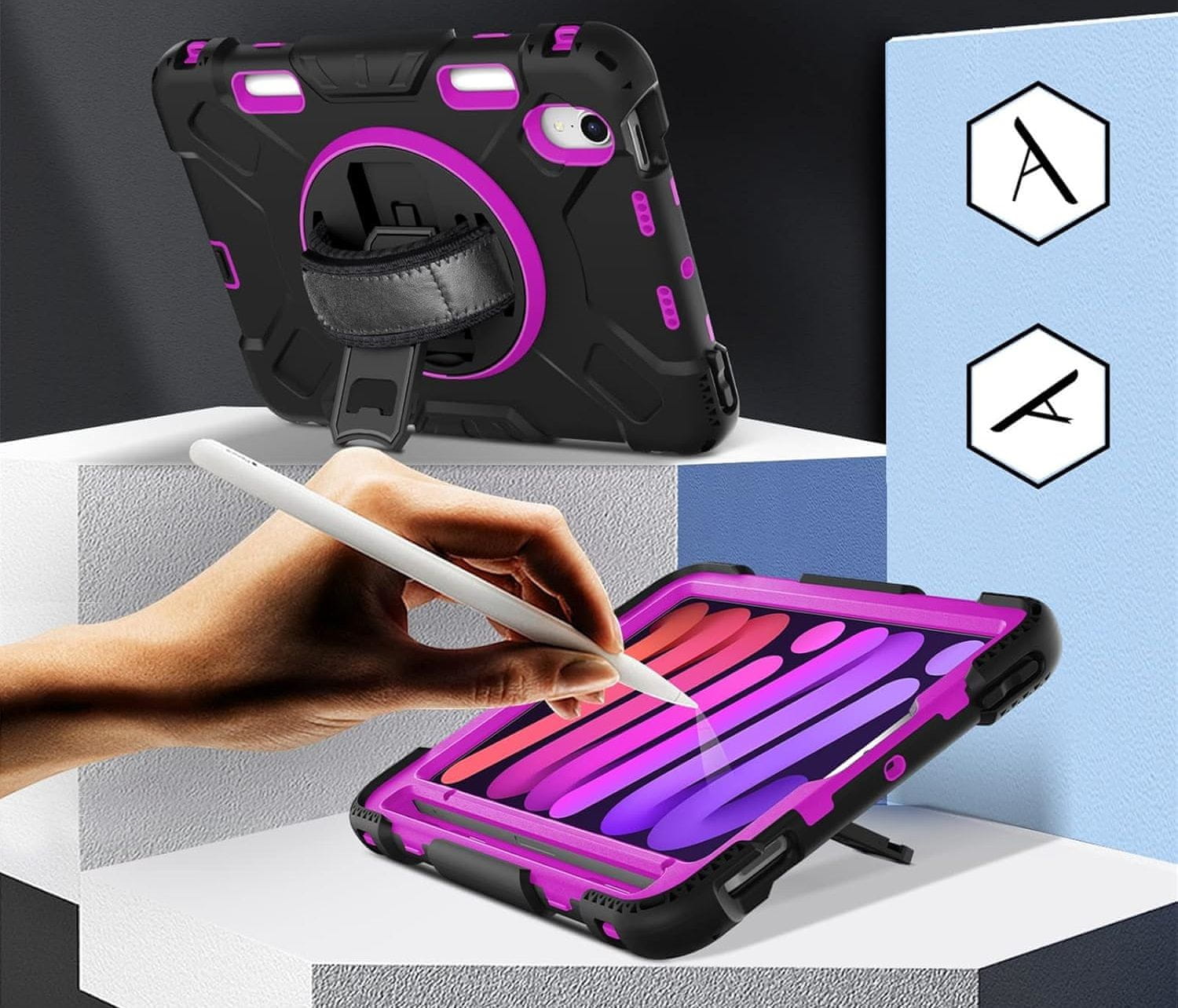 Ova torbica je dizajnirana da pruži vašem uređaju visoku razinu zaštite. Sastoji se od tri sloja: plastičnog kućišta od PC-a i meke silikonske stražnje strane, što štiti tablet od ogrebotina, udaraca i vibracija tijekom svakodnevne upotrebe. Ova praktična torbica ima ugrađeni, sklopivi stalak koji se rotira za 360°, nudeći više kutova korištenja, što čini njenu upotrebu još praktičnijom. Osim toga, jedinstveni držač za olovku olakšava pohranu i vađenje, dok precizno izrađeni izrezi osiguravaju savršeno pristajanje uz priključke i jednostavan pristup svim gumbima.
