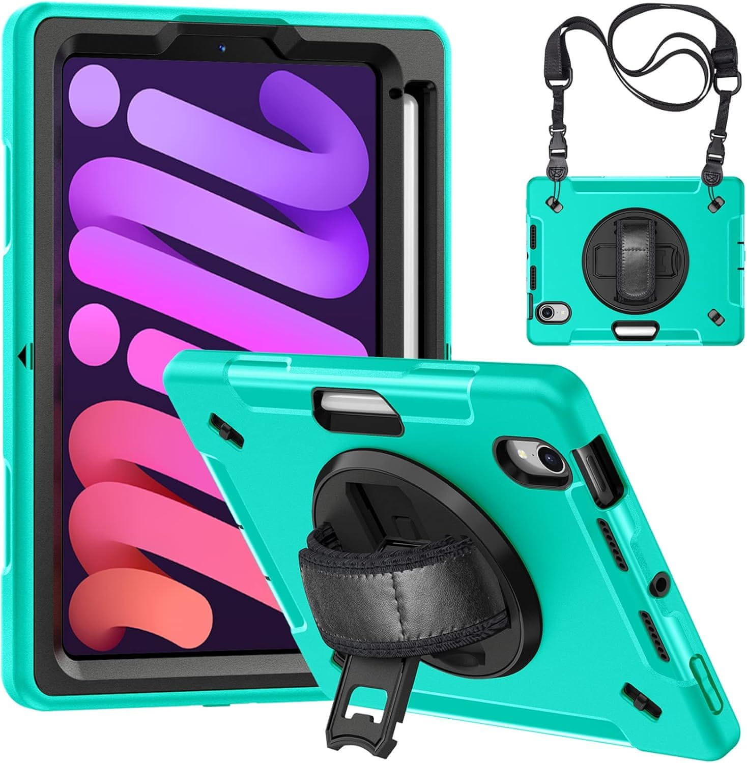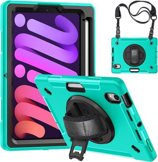 Robusna zelena futrola za iPad Mini 6 (2021, 8,3"). Trostruka zaštita (TPU/PC) od padova i udaraca. Ima 360° rotirajući stalak, remen za ruku i naramenicu za lako nošenje. Ugrađen držač za Apple Pencil.