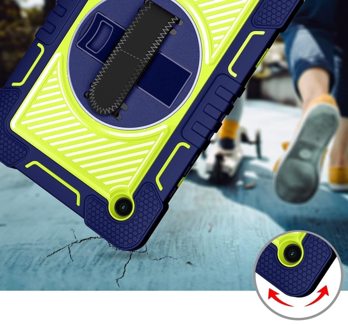 Ova futrola je dizajnirana da pruži vašem uređaju visoku razinu zaštite. Sastoji se od tri sloja: plastičnog kućišta od PC-a i meke silikonske stražnje strane, koja štiti tablet od ogrebotina, udaraca i vibracija tijekom svakodnevne upotrebe. Ova praktična futrola ima ugrađeni, sklopivi stalak koji se okreće za 360°, pružajući više kutova korištenja, što čini upotrebu još udobnijom. Precizno izrađeni izrezi osiguravaju savršeno pristajanje priključcima i jednostavan pristup svim gumbima.