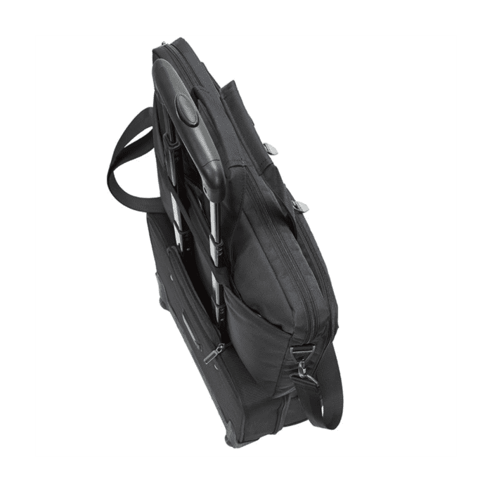 • Vanjski odjeljak na stražnjoj strani ima elastičnu traku za pričvršćivanje torbe na ručku prtljage.