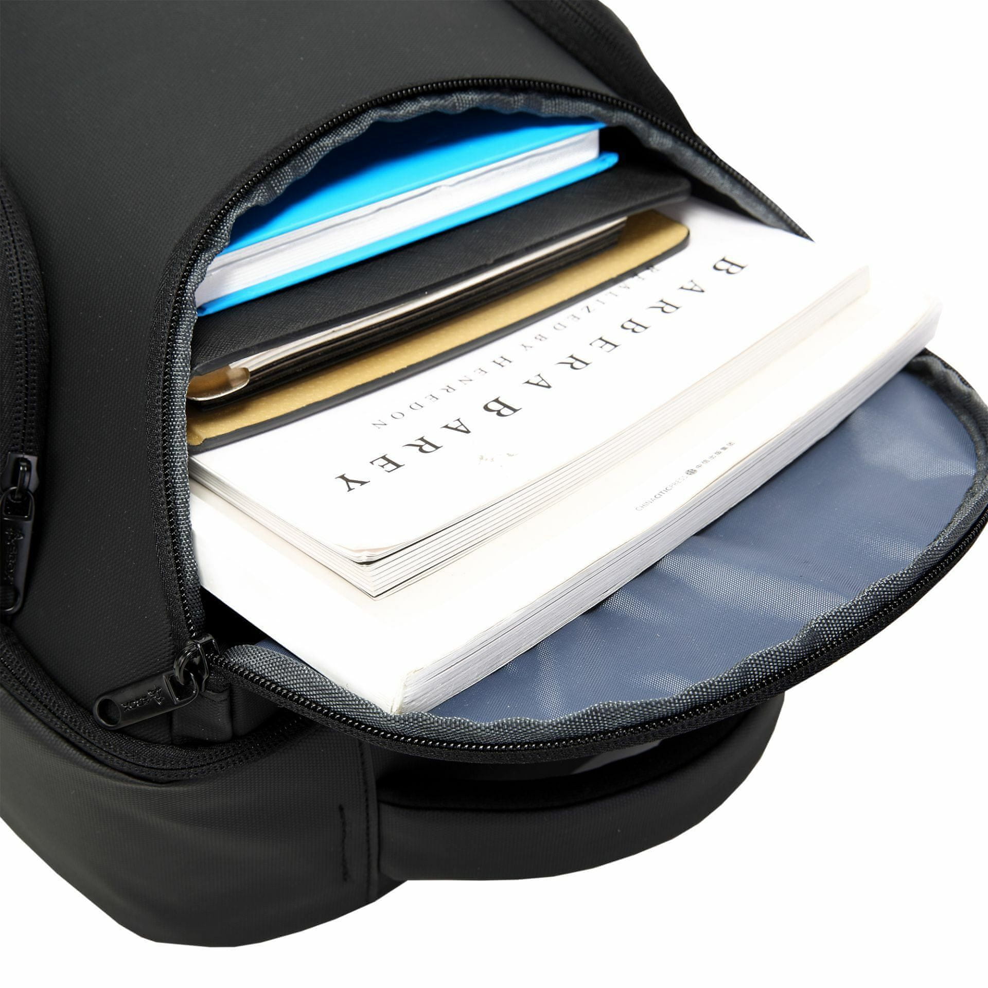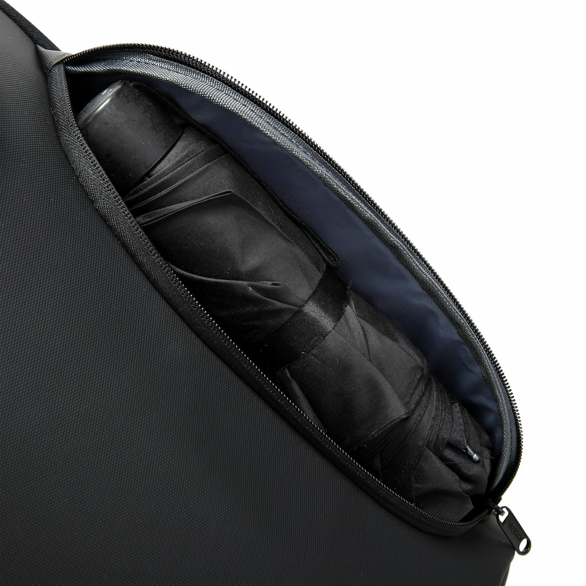 Nahrbtnik je dizajniran za prijenosna računala do 15.6 inča i uključuje glavni pretinac, odvojeni džep za prijenosno računalo te više manjih prostora za dodatke. Poseban zatvoreni pretinac omogućuje pohranu kišobrana, bočni USB priključak omogućuje povezivanje s powerbankom za punjenje uređaja tijekom kretanja. Materijal od 210D poliestera je vodootporan i čisti se vlažnom krpom.