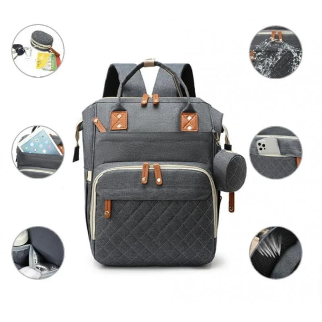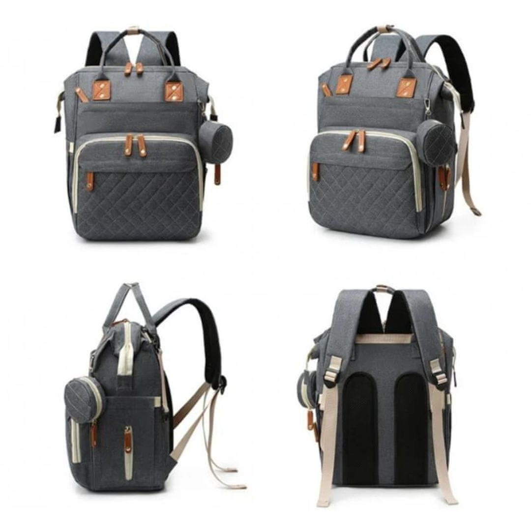Elegantni ruksak za previjanje u sivoj boji s smeđim detaljima, spaja estetiku i funkcionalnost. Izrađen od kvalitetne, lagane i vodootporne tkanine. Ruksak nudi obilje prostora s različitim pregradama i džepovima za organizirano pohranjivanje svih nužnih potrepština za vaše dijete.