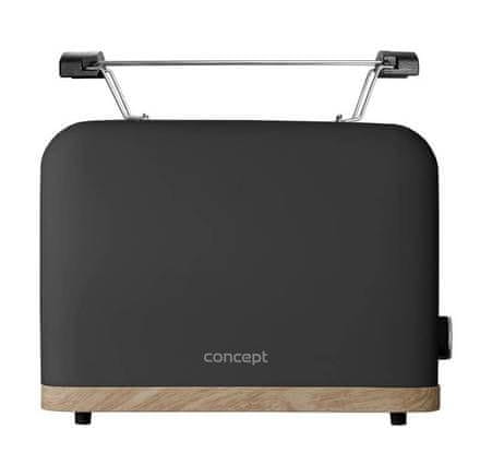 Toster Concept TE2016 ELWOOD omogućuje brzu i jednostavnu pripremu hrskavih tostova. Zahvaljujući 7 razina zapečenosti, možete prilagoditi stupanj pečenja prema vlastitom ukusu – od lagano zlatnih do savršeno hrskavih tostova. Opremljen je s dvije komore za pečenje te funkcijama odmrzavanja, ponovnog zagrijavanja i trenutnog prekida rada. Nakon završetka ciklusa, kruh se automatski podiže, a uređaj se isključuje.