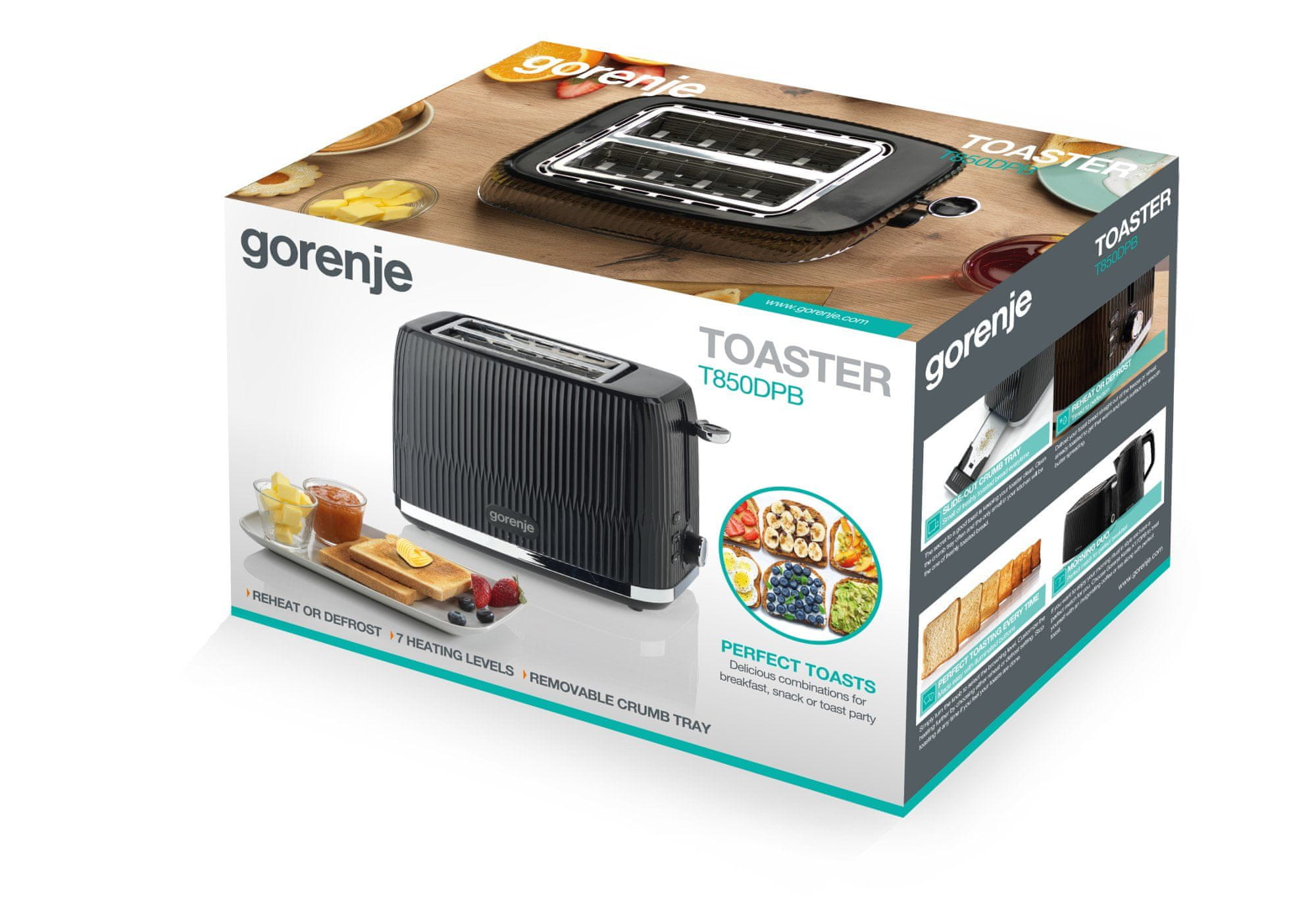 Toster za 2 tosta sa snagom od 850 W. Gorenje T850DPB nudi 7 stupnjeva grijanja, uklonjivu ladicu za mrvice, bijeli indikator rada i automatsko izbacivanje tostera. Funkcija odmrzavanja, odabir stupnja zapečenosti kore i plastične nožice.