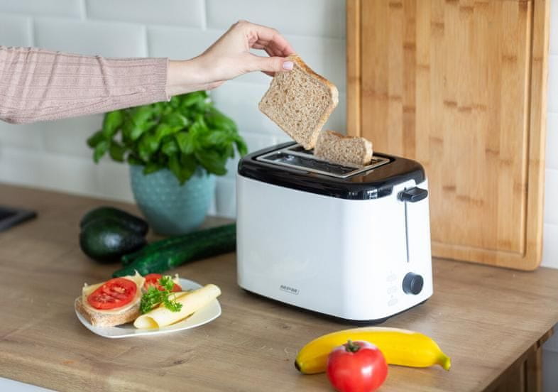 Toster MTO-07 omogućuje vam pripremu ukusnog i hrskavog doručka u samo nekoliko minuta. Ima dvije komore za tostiranje sa sustavom centriranja kruha, što osigurava ravnomjerno tostiranje. Osim toga, s podešavanjem vremena tostiranja u 7 stupnjeva, svatko može odabrati savršenu hrskavost. KARAKTERISTIKE: Toster MTO-07 ima dvije komore za tostiranje sa sustavom centriranja kruha, što osigurava ravnomjerno tostiranje. Dodatne značajke uključuju odmrzavanje, koje vam omogućuje brzu pripremu smrznutog kruha, i zagrijavanje, koje osvježava ohlađene kriške. Ovaj toster nudi mogućnost prekida tostiranja. Ova je opcija korisna kada se odlučite za manje pečene sendviče usred pečenja ili morate ranije napustiti kuću. JEDNOSTAVNO ZA KORIŠTENJE: Toster MTO-07 ima namotavanje kabela za jednostavno spremanje. Osim toga, uređaj je opremljen protukliznim nožicama, što osigurava stabilan položaj na radnoj površini, i uklonjivom posudom za mrvice, što pomaže u održavanju urednosti vaše kuhinje. Bijela boja i jednostavan, elegantan dizajn tostera Mto-07 bit će savršeni i za moderne i za klasične kuhinje. Tehničke specifikacije: