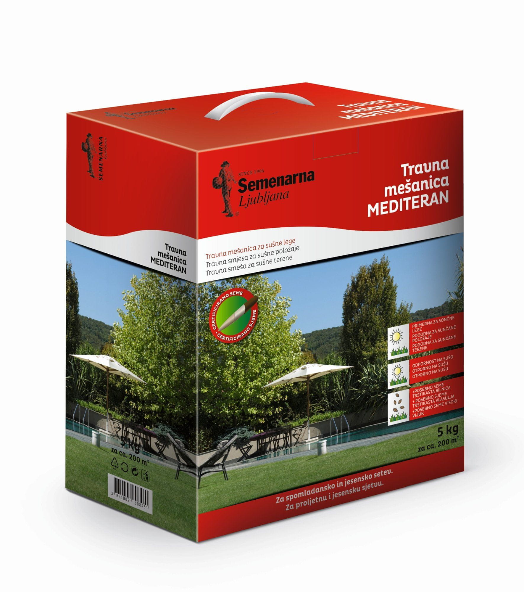 Mediteran je travna mješavina sastavljena od sjemena posebnih vrsta i sorti trava. Njome ozelenjujemo sunčane površine vrtova, parkova i sportskih igrališta. Uz redovitu i dobru njegu, intenzivno zeleni travnjak bit će lijep dugi niz godina.