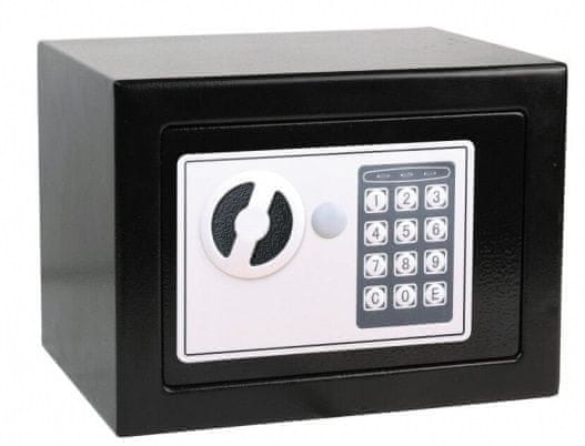 Sef – elektronička brava, otvaranje u nuždi ključem, zvučna i svjetlosna signalizacija, automatsko blokiranje nakon 3 pogrešna koda, mogućnost montaže, čvrsta čelična konstrukcija, napajanje s 4× AA baterije (nisu uključene). Vanjske dimenzije: 23 × 17 × 17,5 cm