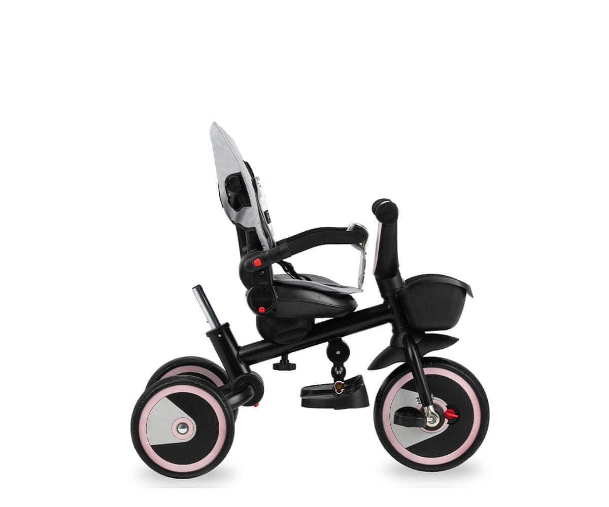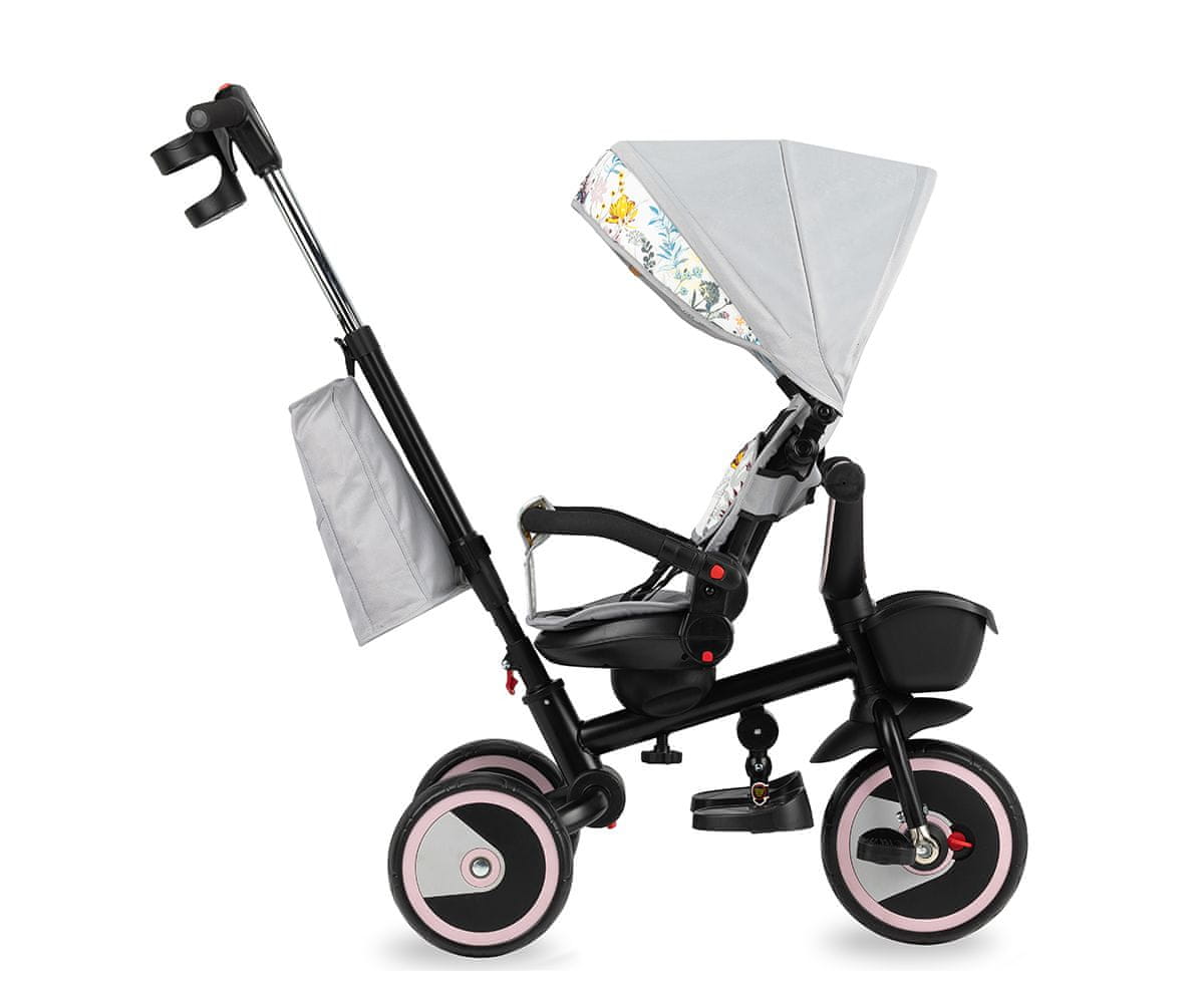 5u1 – od alternative kolicima do samostalnog tricikla. Teleskopska ručka – njome roditelj može upravljati vozilom. Podesivo sjedalo – možete ga rotirati za 360° i postaviti prema naprijed ili prema natrag. Podesivi naslon i baldahin – prilagodljivi potrebama djeteta. Funkcija slobodnog trčanja – kada roditelj vozi tricikl, dijete može slobodno držati noge na pedalama. Praktični držač – za šalicu i torbu. Zaštitna ograda – može se i skinuti. Jednostavna montaža – brzo i bez upotrebe alata.Funkcija mirovanja