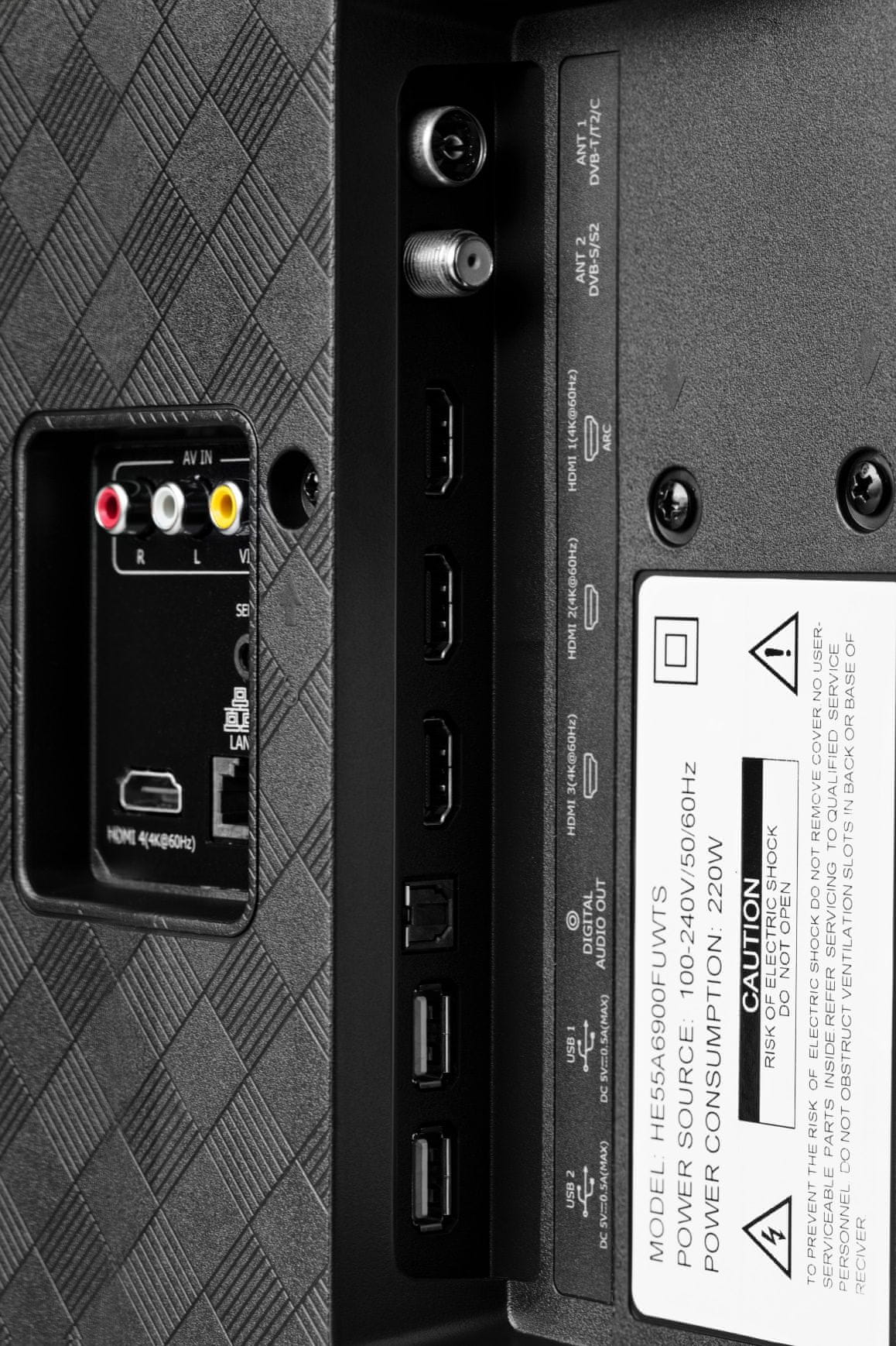 | Priključci / Izlazi / Ulazi | 1× standardno sučelje (CI+): V1.4; 1 x HDMI2.0/ARC; 3 x HDMI2.0; 2 x USB (2.0); 1 x S/PDIF izlaz; 1 x audio (L/D) ulaz; 2 x RF prijemnik; 1 x AV ulaz; 1 x RJ45 Ethernet |