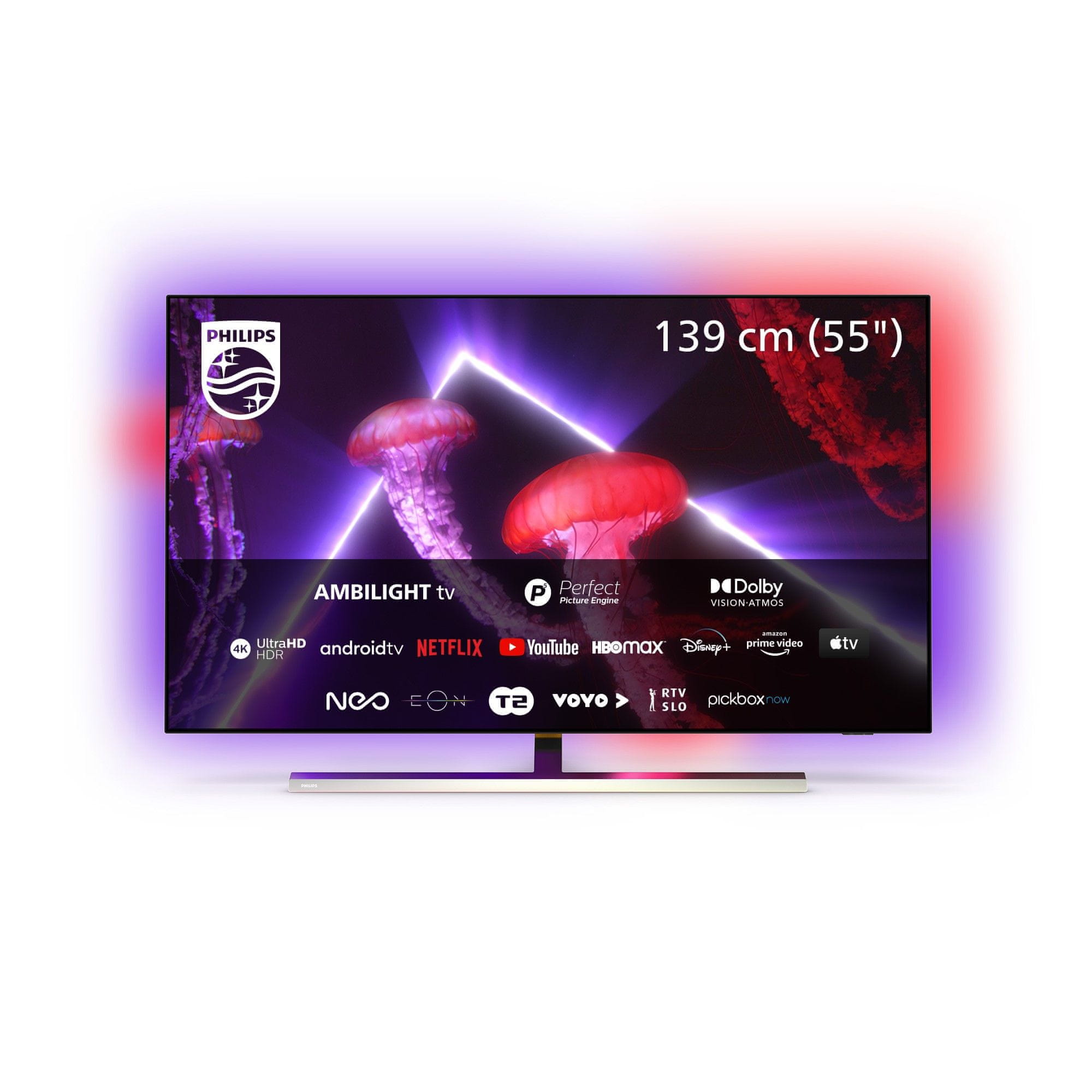 OLED TV dijagonale 139 cm (55") i rezolucije 4K Ultra HD (3840×2160), tuner DVB-T/T2 (HEVC)/C/S2 , četverostrani Ambilight, HDR: Dolby Vision, HDR10+ Adaptive, HLG. Operativni sustav Android, Wi-Fi, LAN, Bluetooth, ugrađeni Chromecast, načini igre (FreeSync, G-Sync kompatibilan, ALLM, VRR), DLNA, * *HbbTV, USB memorija + funkcija Timeshift. Vrhunski zvuk Dolby Atmos, DTS Play-Fi, ugrađeni subwoofer. Povezivanje: **4× HDMI 2.1 (eARC, CEC), 3× USB 2.0, optički audio ulaz, izlaz za slušalice, CI+ utor.
