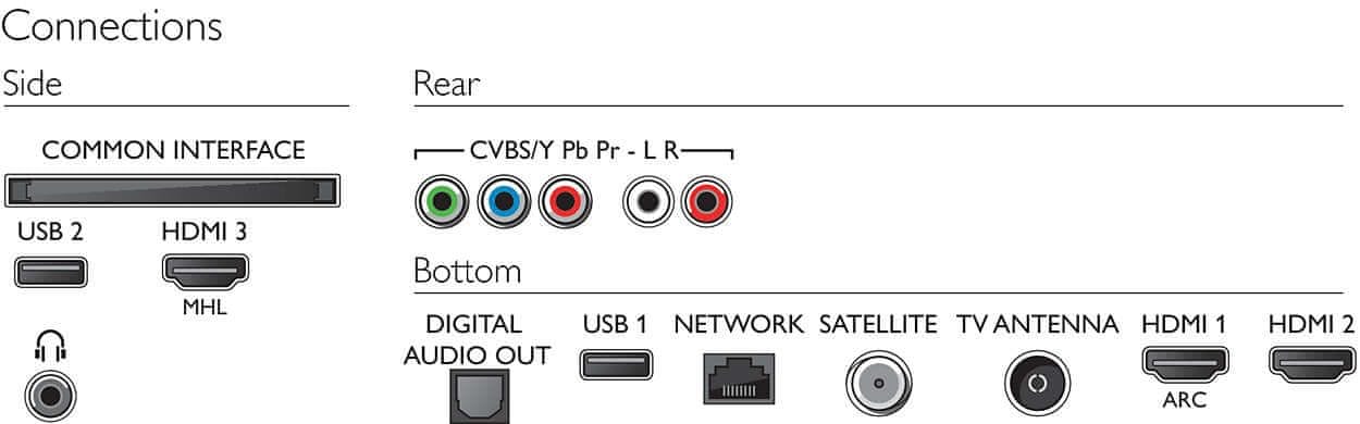 | Ostali priključci | antena IEC75, satelitsko povezivanje, standardno sučelje plus (CI +), digitalni audio izlaz (optički), Ethernet-LAN RJ-45, audio ulaz L / D, izlaz za slušalice |