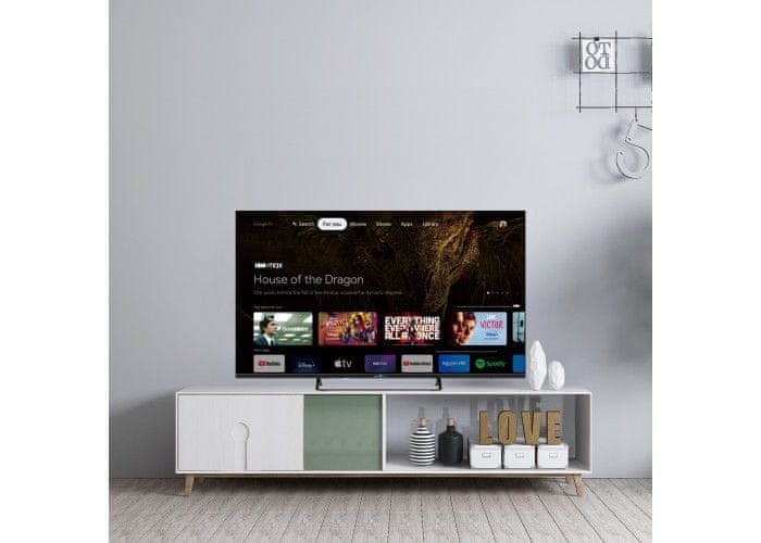 | Ostalo | Procesor: 4-jezgreni Operativni sustav: Android 11.0 HbbTV 2.0 Smart TV portal: Da LAN: Da WiFi 802.11a/b/g/n/ac (2.4G), 2T2R Bluetooth® 2.1+EDR/4.2/5.0 Unaprijed instalirane aplikacije Youtube/Netflix/Prime Video DDR 2G Unutarnja memorija: 8 GB Podrška za daljinski pametni telefon/tablet: Da Wifi zaslon (Miracast) Da (Chromecast) Google pomoćnik: Da |