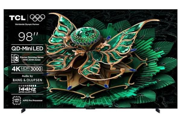QD-Mini LED HDR Premium TV dijagonale 249 cm (98''). Premium Precise Dimming tehnologija, 144 Hz Motion Clarity Pro, Crystglow HVA panel, svjetlina do 3000 nita, Bang & Olufsen 2.2 zvuk sa 60 W, Dolby Atmos i DTS:X. Uključuje Google TV, HDMI 2.1, Game Master značajke, ugrađeni mikrofon.