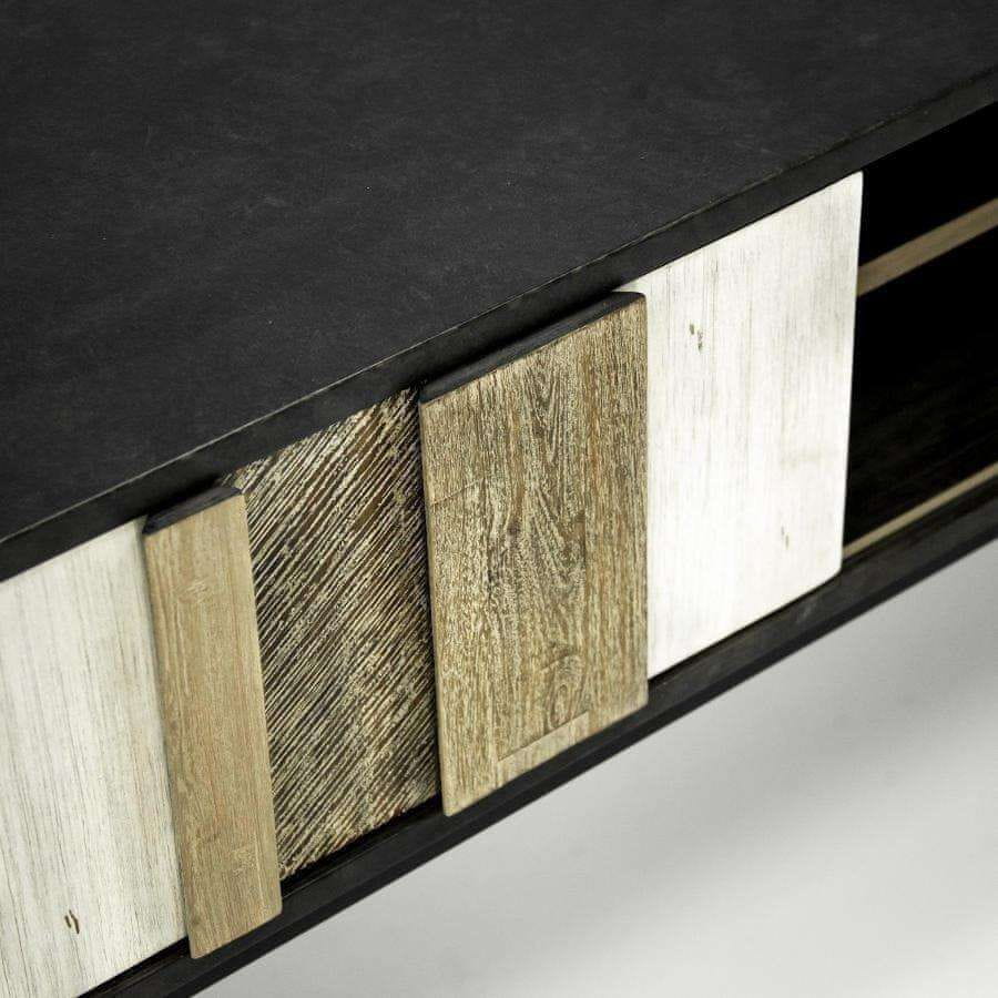 Komoda RTV u retro stilu dizajnirana je kako bi unijela jedinstven karakter u vaš životni prostor. Originalne fronte od punog drva imaju 3D strukturu i raznolike teksture drva što dodaje vizualnu dubinu i taktilni interes. Element je poduprt čvrstim crnim metalnim nogama i pruža praktičan prostor za pohranu vaše multimedijske opreme i dodataka. Detalji: metalne noge Boja: crna nijanse sive i bež crne noge Boja nogu: crna Broj vrata: 1 Broj polica: 2 Materijal: drvo bagrema MDF metalne noge Montaža: montirano Ručke: urezane Težina (kg): 39 Dimenzije (Š x V x D cm): 150 × 55 × 45 cm