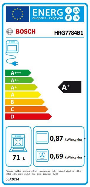 | Volumen | Energetski razred: A+ Koristan volumen pećnice: 71 l Priključna snaga: 3600 W Potrošnja energije u ciklusu – klasično grijanje: 0.87 kWh Potrošnja energije u ciklusu – grijanje s prisilnom cirkulacijom zraka: 0.69 kWh Nazivni napon: 220 – 240 V Duljina električnog kabela: 120 cm |