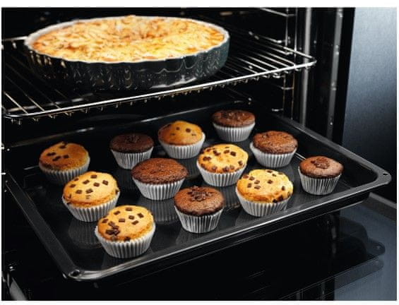 Pećnica Electrolux obujma 65 l pripada energetskom razredu A+. Opremljena je ventilatorom koji omogućuje kruženje zraka i topline unutar pećnice i na taj način osigurava ravnomjernu temperaturu. Omogućuje pečenje na dvije razine, s ravnomjerno raspoređenom toplinom. Kada ste u žurbi, koristite funkciju brzo zagrijavanje i tako značajno skratite vrijeme zagrijavanja pećnice. Kada se postigne odabrana temperatura, bit ćete obaviješteni zvučnim signalom. Može se pohvaliti sustavom upravljanja koji sugerira optimalnu temperaturu prema odabranom programu. Također je opremljen funkcijom automatsko isključivanje i zaključavanjem za djecu, koja štiti od slučajnog uključivanja ili promjene programa. Indikator preostale topline i automatsko isključivanje ventilatora kada su vrata pećnice otvorena osiguravaju uštedu energije. Omogućuje jednostavno rukovanje putem udubljenih gumba i LED zaslona osjetljivog na dodir. Njegova površina od nehrđajućeg čelika je otporna na otiske prstiju, što uvelike olakšava njegovo čišćenje.