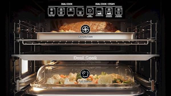 Ugradbena pećnica Samsung nudi korisni volumen od 76 l i pripada energetskom razredu A+. Može se pohvaliti Dual Cook sustavom pečenja, koji omogućuje odvojeno korištenje gornjeg i donjeg dijela pećnice. Možete koristiti samo gornji dio za manja jela, obje zone za kuhanje s različitim postavkama ili istovremeno koristiti za kuhanje velikih jela. Uz to se može pohvaliti funkcijom prženja na vrućem zraku, koja kombinacijom posebnog pladnja i cirkulacije vrućeg zraka priprema savršeno pržena jela, bez upotrebe pretjerane masnoće. Također nudi Air Sous Vide sustav kuhanja (zahtijeva sous vide vrećicu, prodaje se zasebno), koji održava ravnomjernu temperaturu u cijeloj unutrašnjosti pećnice za ravnomjerno kuhanje sočnih jela.
