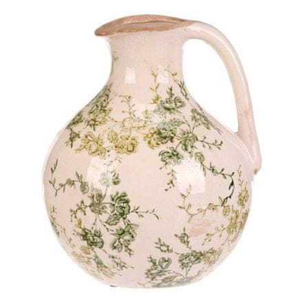 Keramička vaza u obliku vrča u retro stilu impresionirat će svojim nježnim dekorom zelenog cvijeća na kremastoj podlozi. Njezin zaobljeni oblik s uskim grlom i praktičnom ručkom omogućuje jednostavno ulijevanje i dekorativnu upotrebu. Površina je glazirana nježnom patinom koja naglašava vintage karakter proizvoda. Vaza je prikladna za aranžmane od suhog i svježeg cvijeća, a zahvaljujući veličini L postat će upečatljiv dodatak interijeru s rustikalnim ili retro prizvukom.