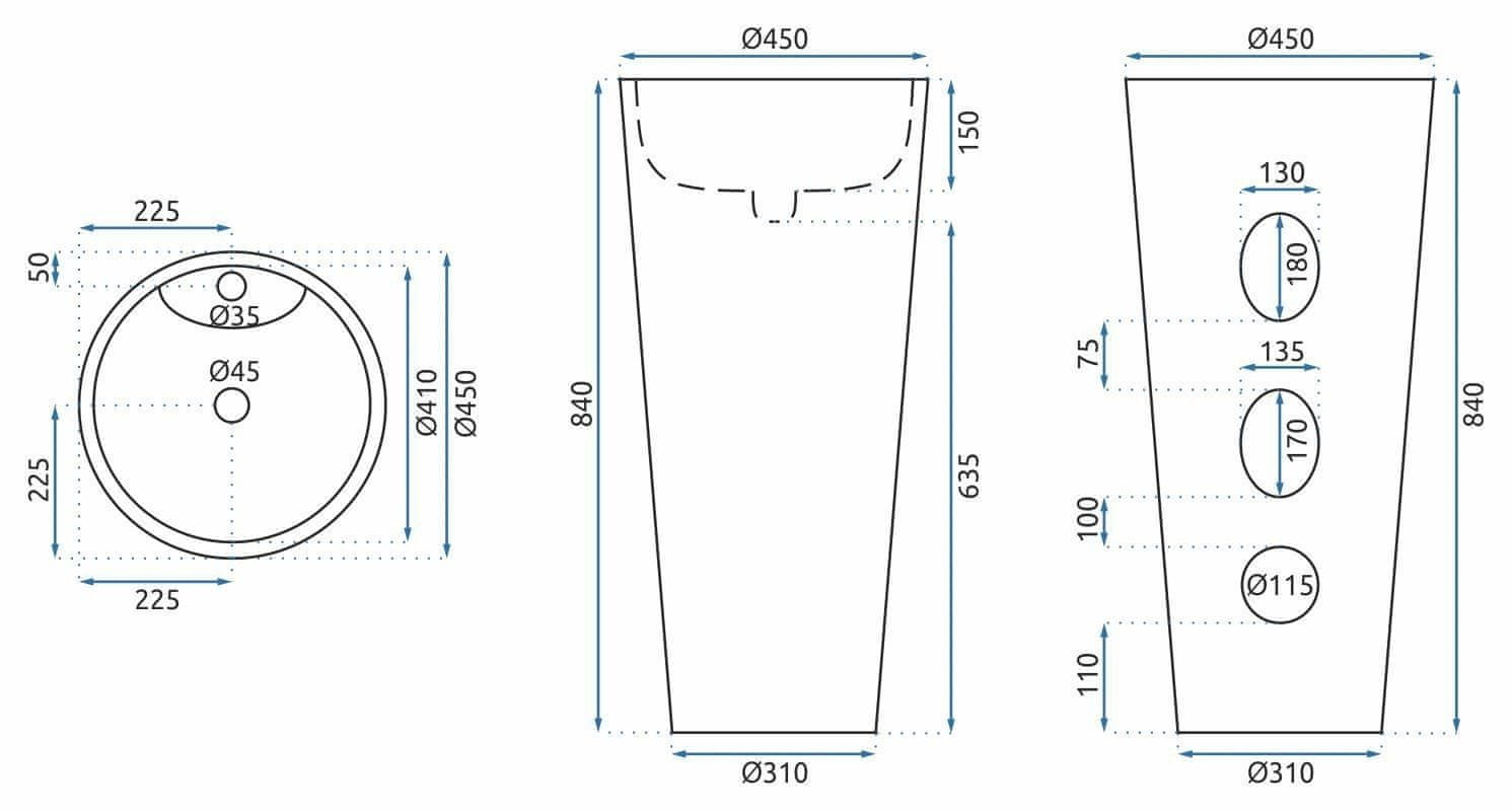 Samostojeći keramički umivaonik jedinstven je proizvod dizajniran s obzirom na izgled i funkcionalnost. Nevjerojatno moderan dizajn savršeno će se uklopiti u svaku kupaonicu sa stilom. Klasičan oblik posude, otvor za pipu i preljev čine je praktičnim odabirom u vašoj kupaonici.Način montaže: SamostojećaMaterijal: Sanitarna keramikaBoja: Imitacija kamenaZavršetak: MatDuljina: 450Širina: 450Visina: 840Dubina: 150Oblik: OkrugliOtvor za slavinu: 1Preljevna rupa: 1