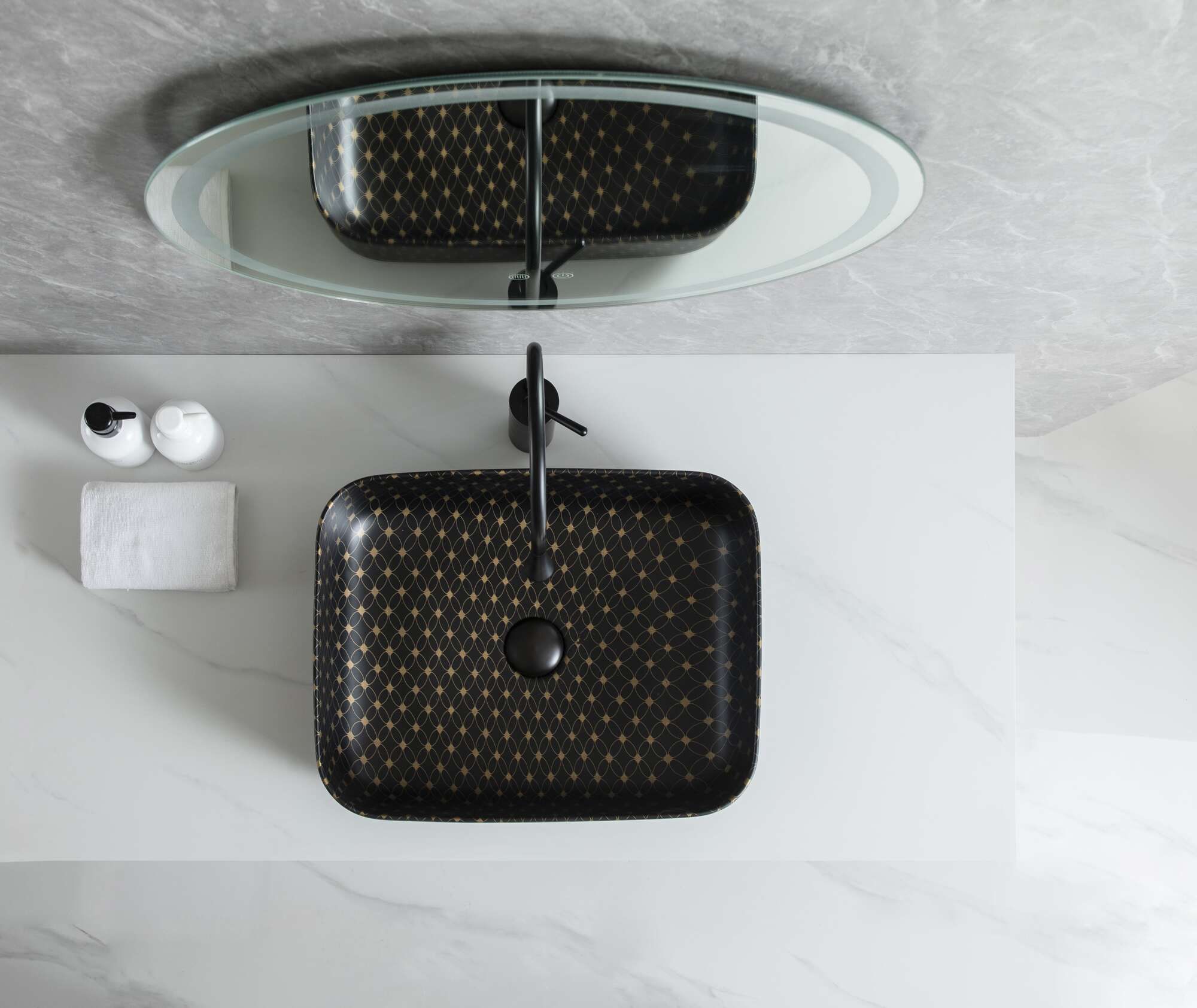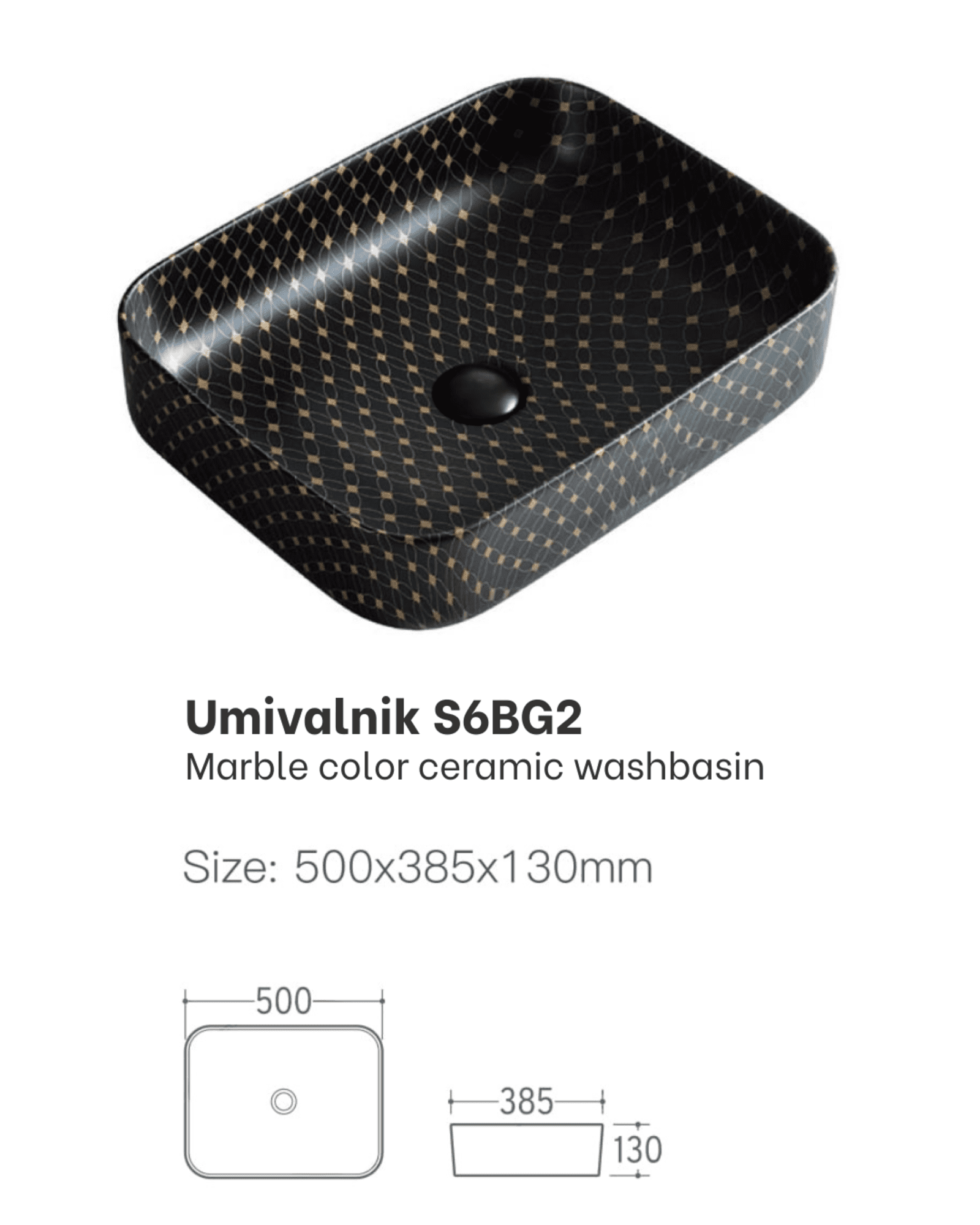 Umivaonik crni mramor S6BG2 spaja suvremen izgled s vrhunskom kvalitetom. Zahvaljujući naprednoj tehnologiji water transfer printing, ima prekrasnu, duboko crnu teksturu s mat efektom, koja prostoru dodaje dašak luksuza i minimalističke elegancije. Njegov ovalni oblik i nježne linije savršeno se uklapaju u moderne, industrijske i retro kupaonice. Izrađen je od visokokvalitetne keramike, otporne na ogrebotine i mrlje, što omogućava jednostavno čišćenje i dugotrajnu izdržljivost.