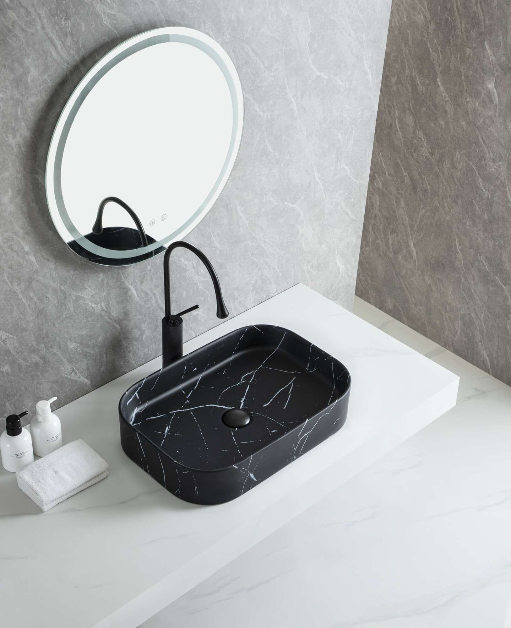 Elegantna snaga prirode u vašoj kupaonici!Umivaonik crni mramor S6BW21 oduševljava realističnim uzorkom mramora, stvorenim naprednom tehnologijom tiska vodnim prijenosom (water transfer printing), koja naglašava prirodne linije i duboku crnu boju. Ovaj umivaonik spaja profinjen izgled kamena s vrhunskom kvalitetom keramike, što osigurava dugotrajnu ljepotu, otpornost i jednostavno održavanje.