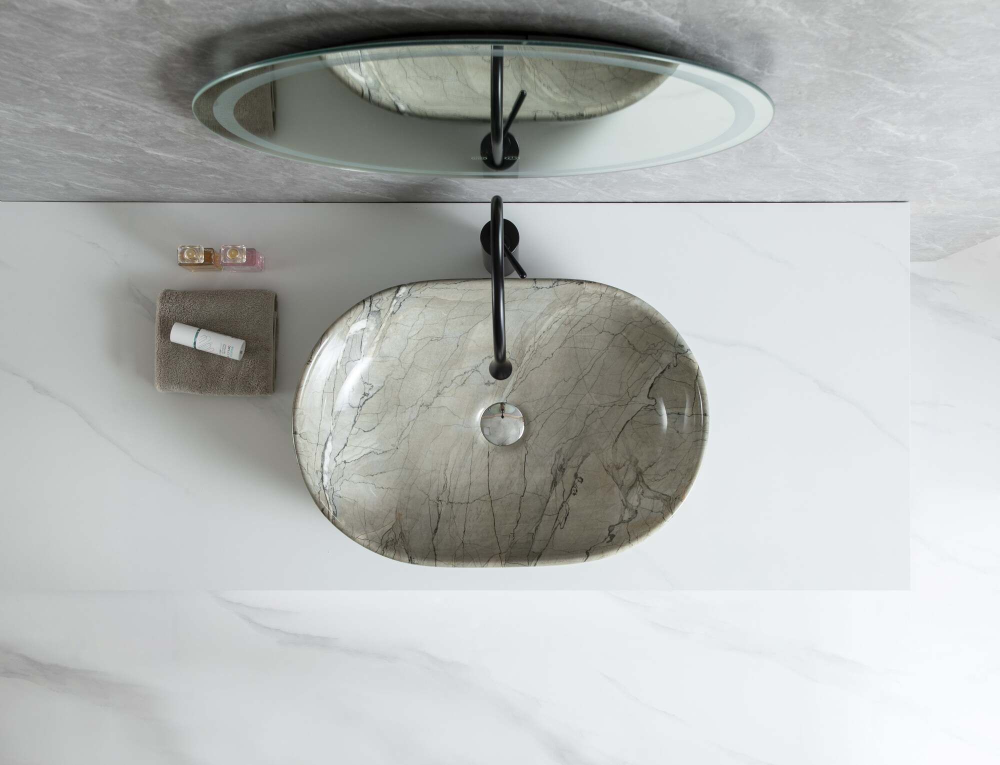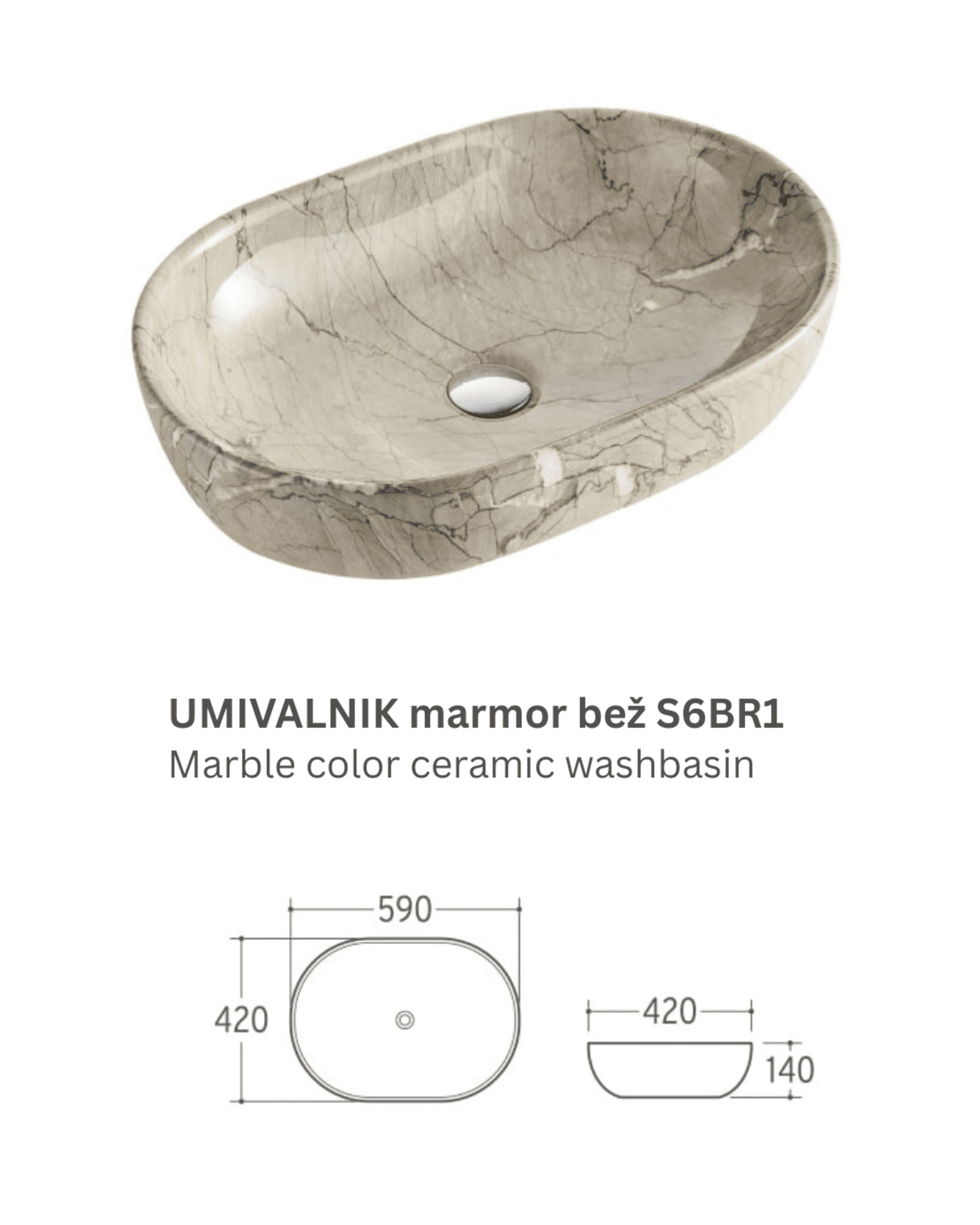 Umivaonik mramor bež S6BR1 je ovalni nadpultni umivaonik koji svojom mekom mat površinom i nježnim uzorkom bež mramora unosi u kupaonicu osjećaj topline, prirodnosti i bezvremenskog stila. Njegov elegantan oblik savršeno se uklapa u moderne, minimalističke ili prirodom inspirirane interijere.
