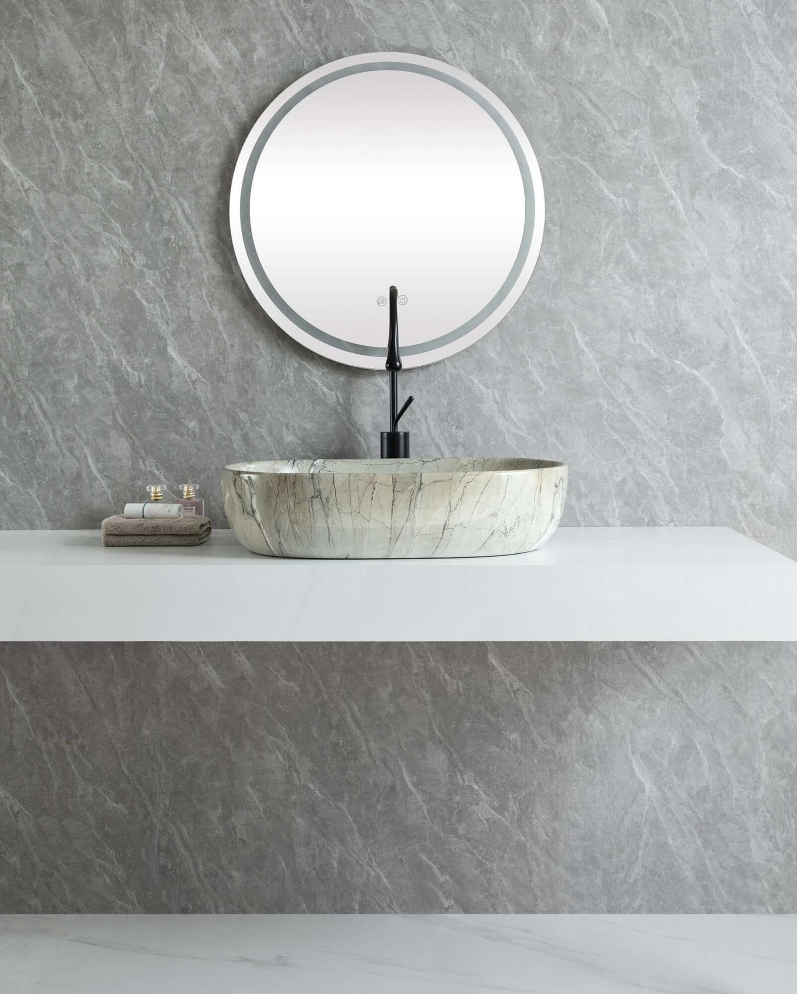 Izrađen je od visokokvalitetne keramike, obrađene naprednom tehnologijom vodenog transfer tiska, koja stvara realističan izgled mramora. Glatka površina pruža ugodan dodir i omogućuje jednostavno čišćenje bez vidljivih mrlja i kamenca.