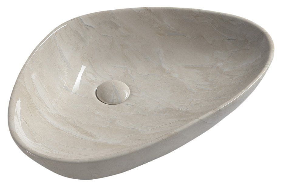 Serija keramičkih umivaonika DALMA impresionira njegov kameni efekt. Sudoperi su glazirani pečenim naljepnicama u kamenom dizajnu, što jamči stabilnost i trajnost dekora. Možete birati ne samo između tri dekora u mramornim nijansama, već i između pet oblika. Sudoperi su namijenjeni za postavljanje na radnu površinu, a za sve njih može se kupiti zatvarajući odvod u boji sudopera.
