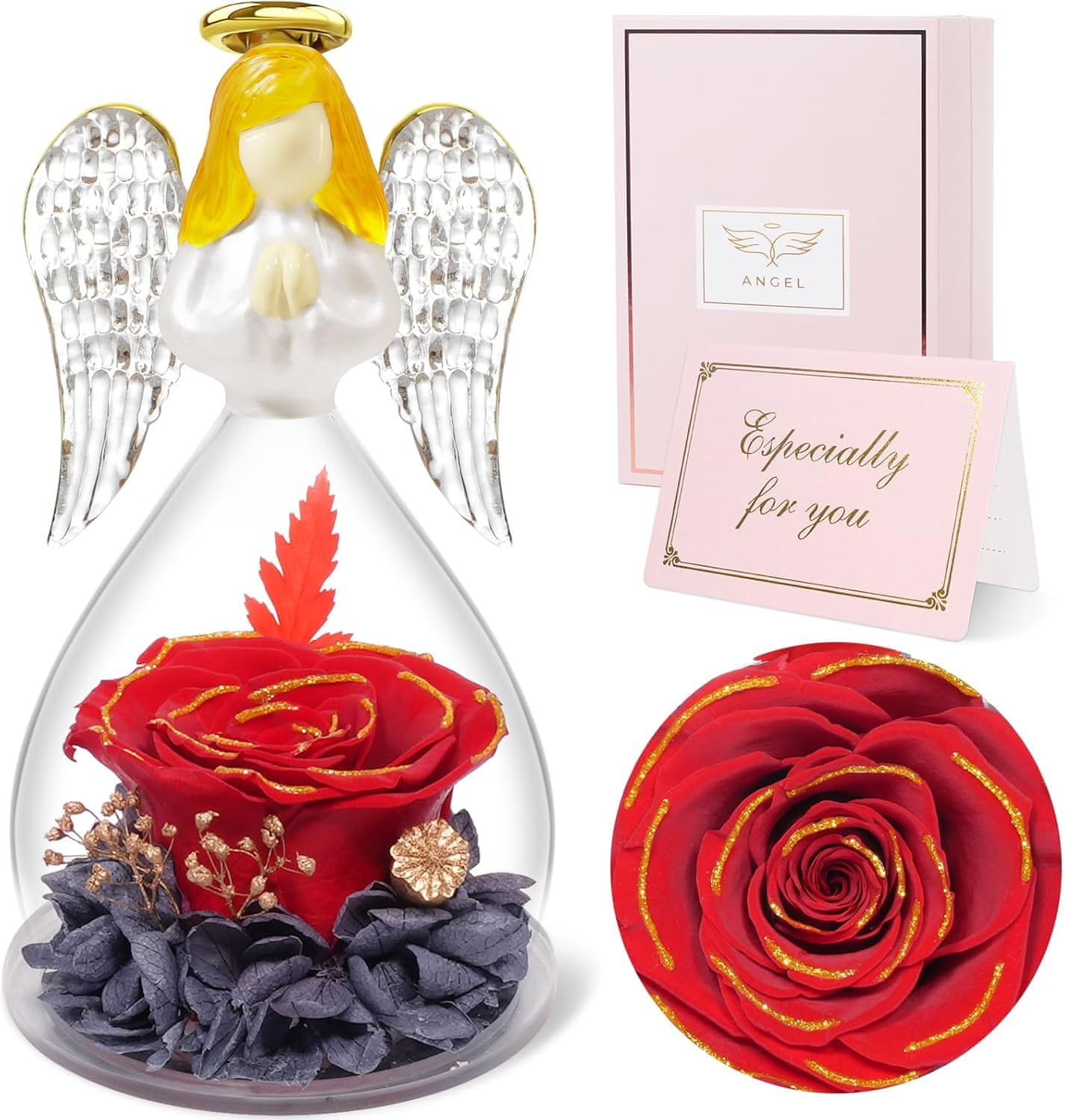 Nikcorp Figurica anđela s pravim konzerviranim ružama, crveno zlato, staklena kupola, poklon za mamu i baku, trajni ukras