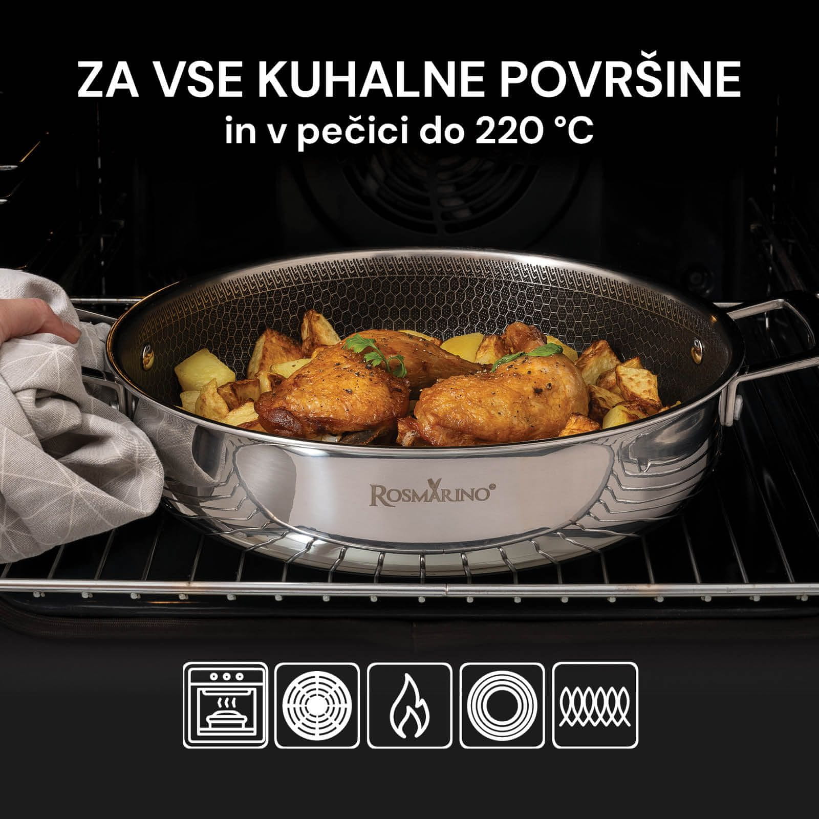 Rosmarino HexaPRO je vrhunska linija posuđa s hibridnom tehnologijom koja osigurava profesionalne rezultate, iznimnu izdržljivost, otpornost na ogrebotine te korištenje na svim površinama za kuhanje i u pećnici do 220°C.