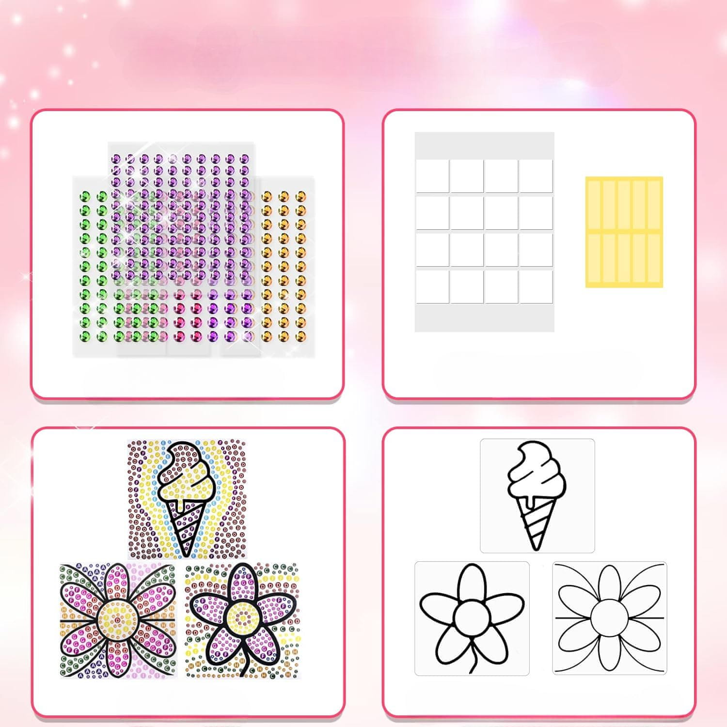 Nikcorp Set za dijamantno slikanje za djecu, kreativni DIY mozaik za izradu naljepnica, 3 motiva cvijeća i sladoleda, 17x17 cm