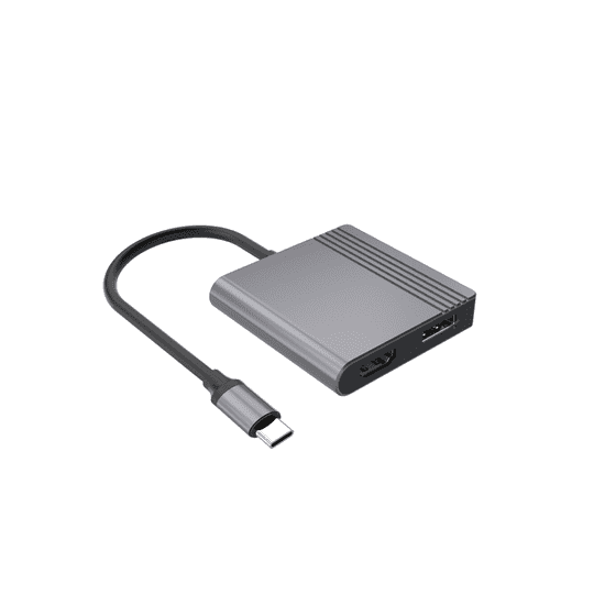 Adapter USB tipa C (muški) na HDMI + DisplayPort (ženski). Omogućuje povezivanje HDMI i/ili DP monitora, televizora ili projektora na USB-C priključak. Radi na bilo kojem uređaju koji ima USB Type-C priključak s omogućenim videom. Jednostruki i dvostruki izlaz podržavaju rezoluciju do 4K pri 60 Hz.