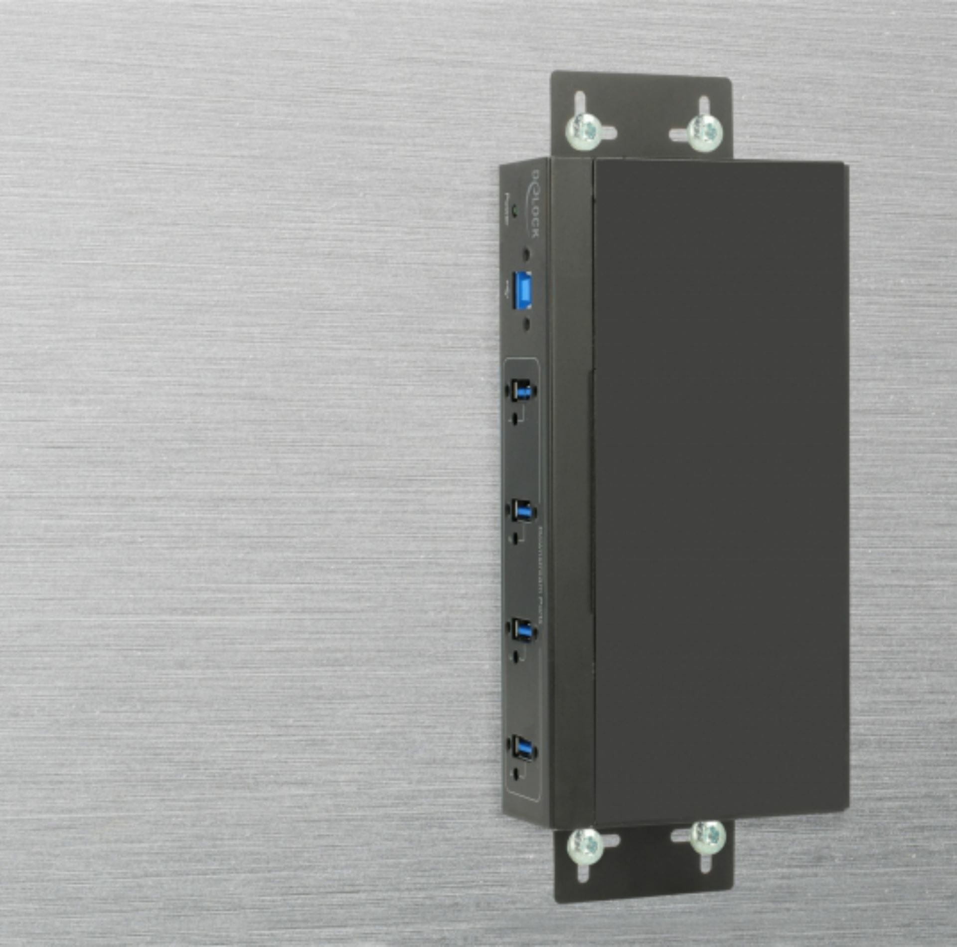 Ovaj čvrsti USB kompatibilan industrijski koncentrator tvrtke Delock može se spojiti na računalo preko USB Tip-A sučelja. Nadograđuje računalo s četiri USB Tip-A spojnika, koji podržavaju specifikaciju USB punjenja baterije BC1.2. Stoga se priključeni uređaji poput pametnih telef
