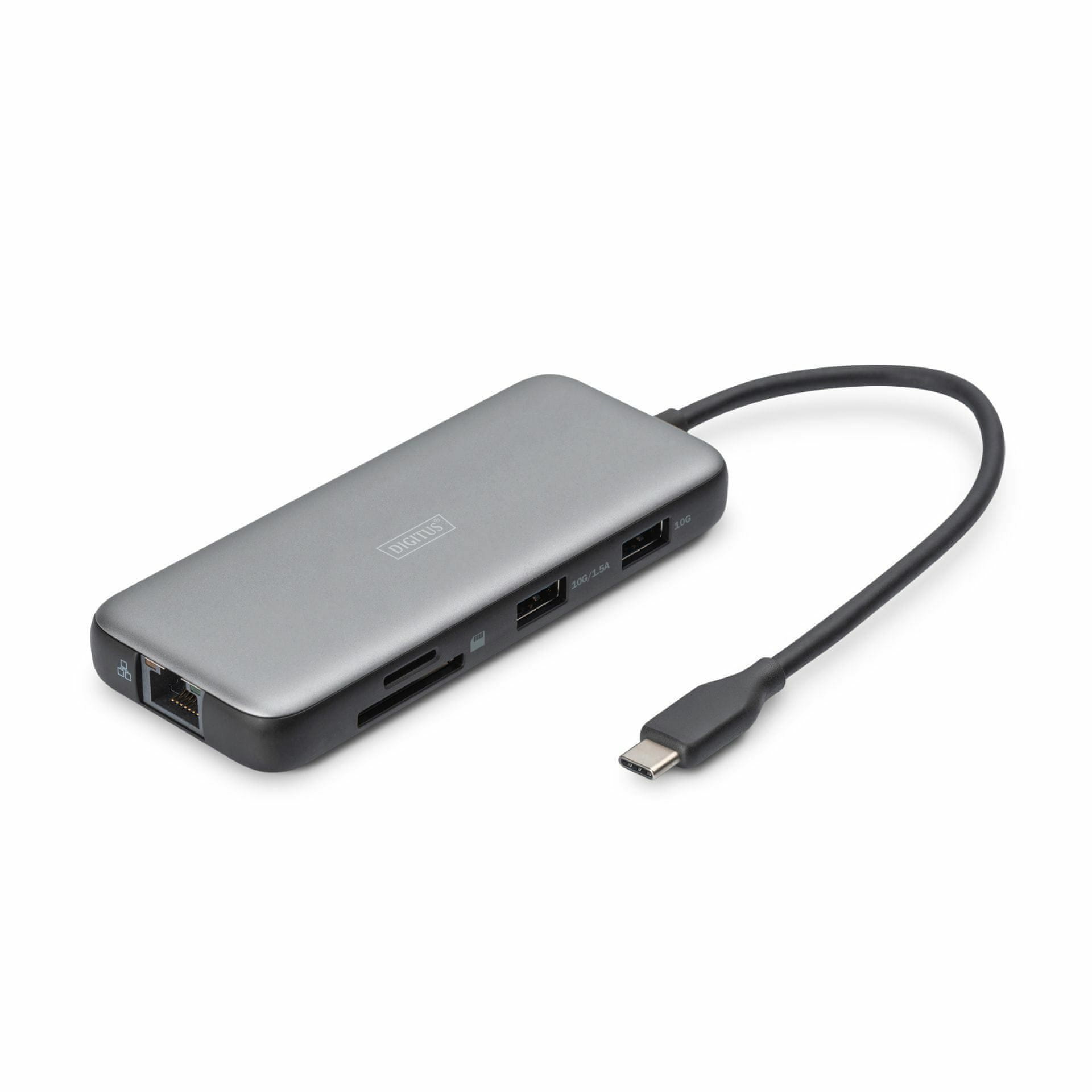 S Digitus 8-u-1 priključnom stanicom DA-70915, proširite mogućnosti povezivanja. Podržava dva 4K/60Hz monitora putem HDMI-ja u SST i MST načinima. USB-A 3.2 Gen 2 omogućuje brzi prijenos podataka, Gigabit Ethernet pouzdanu mrežu, a čitači kartica brzo prenose podatke. USB-C PD puni prijenosno računalo za neometan rad.
