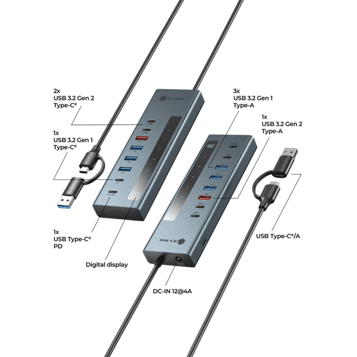 Kućište od aluminija s pasivnim hlađenjem osigurava dobru toplinsku stabilnost, dok integrirani USB-C/A host kabel omogućuje univerzalno povezivanje s USB-C i USB-A računalima. Hub također uključuje ON/OFF gumb i LED indikator za nadzor rada. Napajanje 12 V / 4 A isporučuje se u paketu. IB-HUB1743-CPD je kompatibilan s Windows, macOS i Linux, što omogućuje korištenje u različitim radnim okruženjima te nudi fleksibilno i pouzdano proširenje priključaka za moderne prijenosnike i stolna računala.