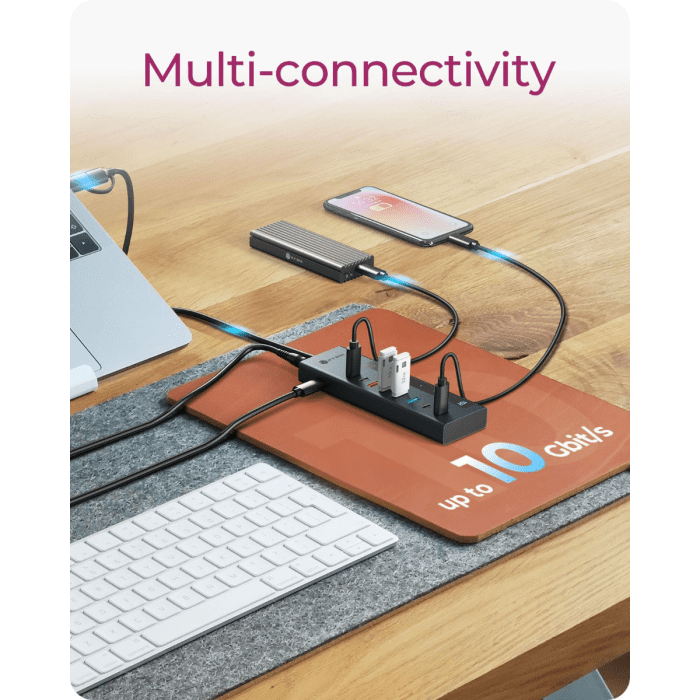 IB-HUB1743-CPD je moćan višeključni USB-C razdjelnik, dizajniran za korisnike koji trebaju brzo povezivanje, stabilno napajanje i proširenu funkcionalnost u kompaktnoj aluminijskoj izvedbi. Hub se povezuje s računalom putem sučelja USB-C 3.2 Gen 2 i omogućuje prijenose podataka do 10 Gbit/s, podržavajući UASP te Plug & Play za trenutnu upotrebu bez dodatnih upravljačkih programa. Uređaj uključuje kombinaciju USB-A i USB-C priključaka: jedan USB-A 3.2 Gen 2, tri USB-A 3.2 Gen 1, jedan USB-C 3.2 Gen 1 i dva USB-C 3.2 Gen 2, što omogućuje istovremeno povezivanje više vanjskih uređaja, poput memorijskih medija, periferija ili dodatne opreme. Ugrađeni USB-C Power Delivery port omogućava napajanje uređaja snagom do 20 W, dok USB-C upstream PD osigurava do 100 W snage za napajanje laptopa. LED ekran omogućuje nadzor potrošnje energije u stvarnom vremenu.