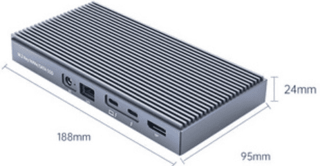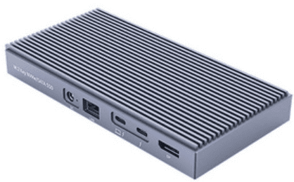 Priključna stanica s aluminijskim kućištem osigurava jednostavnu instalaciju dva M.2 NVMe SSD-a. Stanica sadrži DisplayPort 1.4 za prijenos slike do 8K @ 60Hz, 3× USB-A ulaz, 1× USB-C ulaz i jedan USB-C PD 60W ulaz. Stanica također omogućuje spajanje mrežnog kabela na RJ45 konektor.