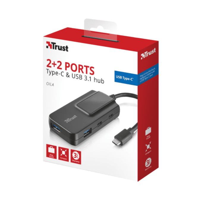 Trust 21321 Oila je USB 3.1 Gen 1 hub s 2 USB A i 2 USB C vrata za prijenos podataka ili povezivanje uređaja. Uključuje USB C kabel za priključak na laptope i tablete. Kompatibilan s USB 3.0 i 2.0 uređajima. Idealan za brzi prijenos podataka.