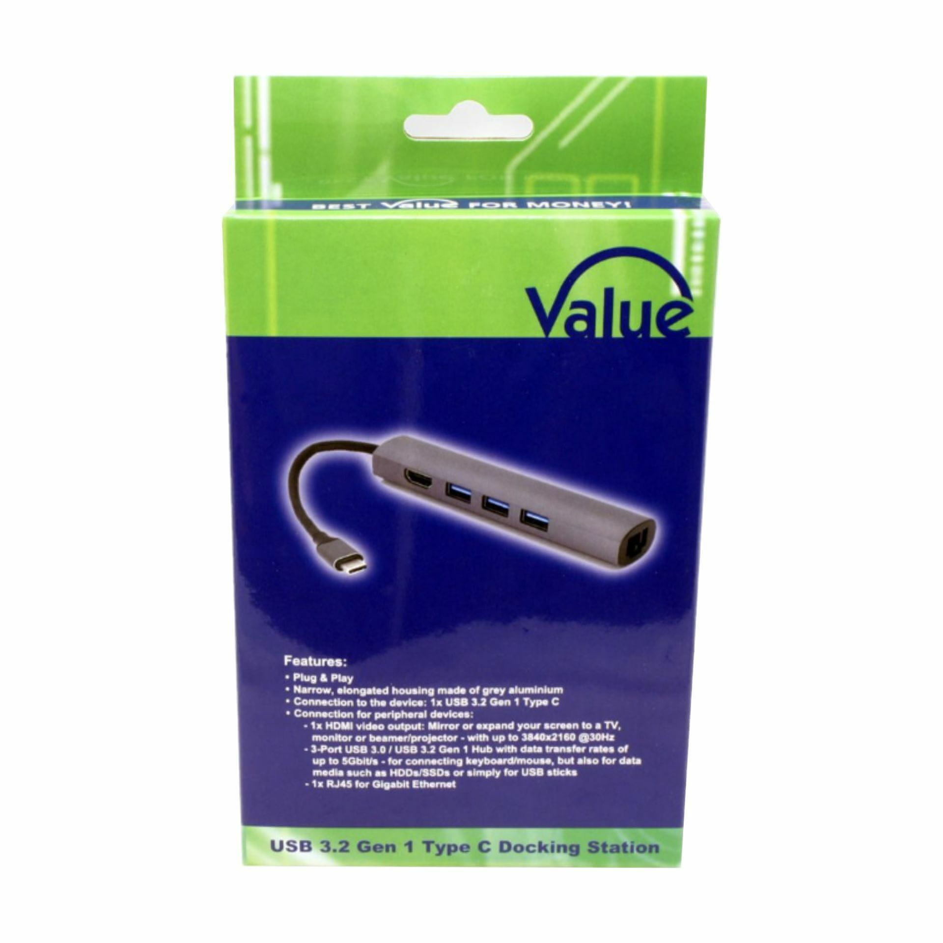 Value pretvornik USB 3.2 Gen1 Tip-C docking station omogućuje vašem prijenosniku 5 dodatnih priključaka samo korištenjem jednog USB Tip-C priključka. Docking stanica nudi video sučelje (HDMI). Također nudi tri USB 3.2 Gen1 tip-A priključka i gigabitni RJ45 priključak za mrežnu vezu.
