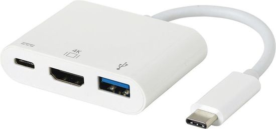 USB-C AV multiport hub. Ovo je adapter s USB-C na USB3.0 s HDMI-om i Type-C priključkom za punjenje. USB3.0 priključak omogućuje povezivanje USB uređaja ili drugog huba s računalom. USB-C ženski priključak može istovremeno puniti računalo i napajati adapter.