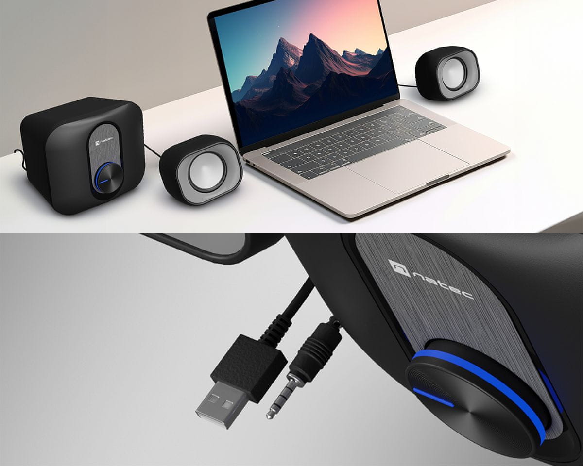 Ponestaje vam prostora, ali vam zvučnici ugrađeni u prijenosno računalo ili monitor nisu dovoljni? Natec PUG je idealan izbor koji će vam omogućiti da uživate u dobroj kvaliteti zvuka čak iu malom prostoru. Štoviše, ovaj mali komplet napaja klasični USB Type-A priključak. Ovo je jednostavno i učinkovito rješenje koje će vam pomoći da zaboravite na zapetljane kablove i teške izvore napajanja.
